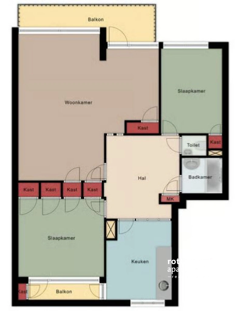 Beveiligde entree, hal met meterkast en toilet. De open L-vormige woonkeuken is uitgerust met een koelkast, keramische kookplaat, magnetron, vaatwasser, RVS afzuigkap, wasmachine en een aparte vriezer. Er is tevens toegang tot een klein balkon aan de voorzijde. De lichte L-vormige woonkamer heeft een mooie parketvloer en een doorgebroken eetkamer. Via een schuifpui is er toegang tot het ruime balkon, gelegen op het zuiden. De ouderslaapkamer bevindt zich aan de voorzijde en is voorzien van een inbouwkastenwand. De tweede slaapkamer bevindt zich aan de achterzijde. De badkamer is uitgerust met een ligbad-/douchecombinatie en een badkamermeubel met wastafel en spiegel.