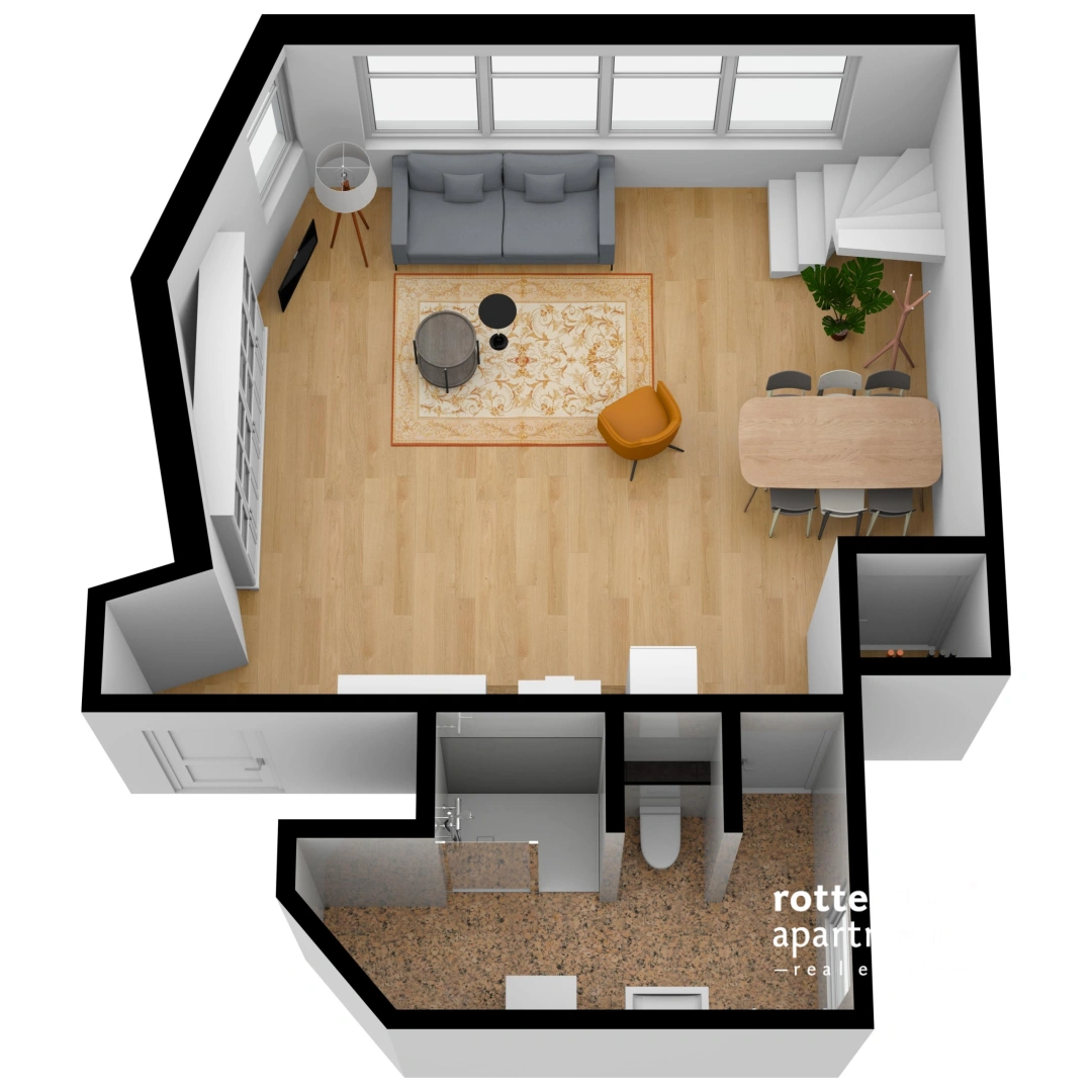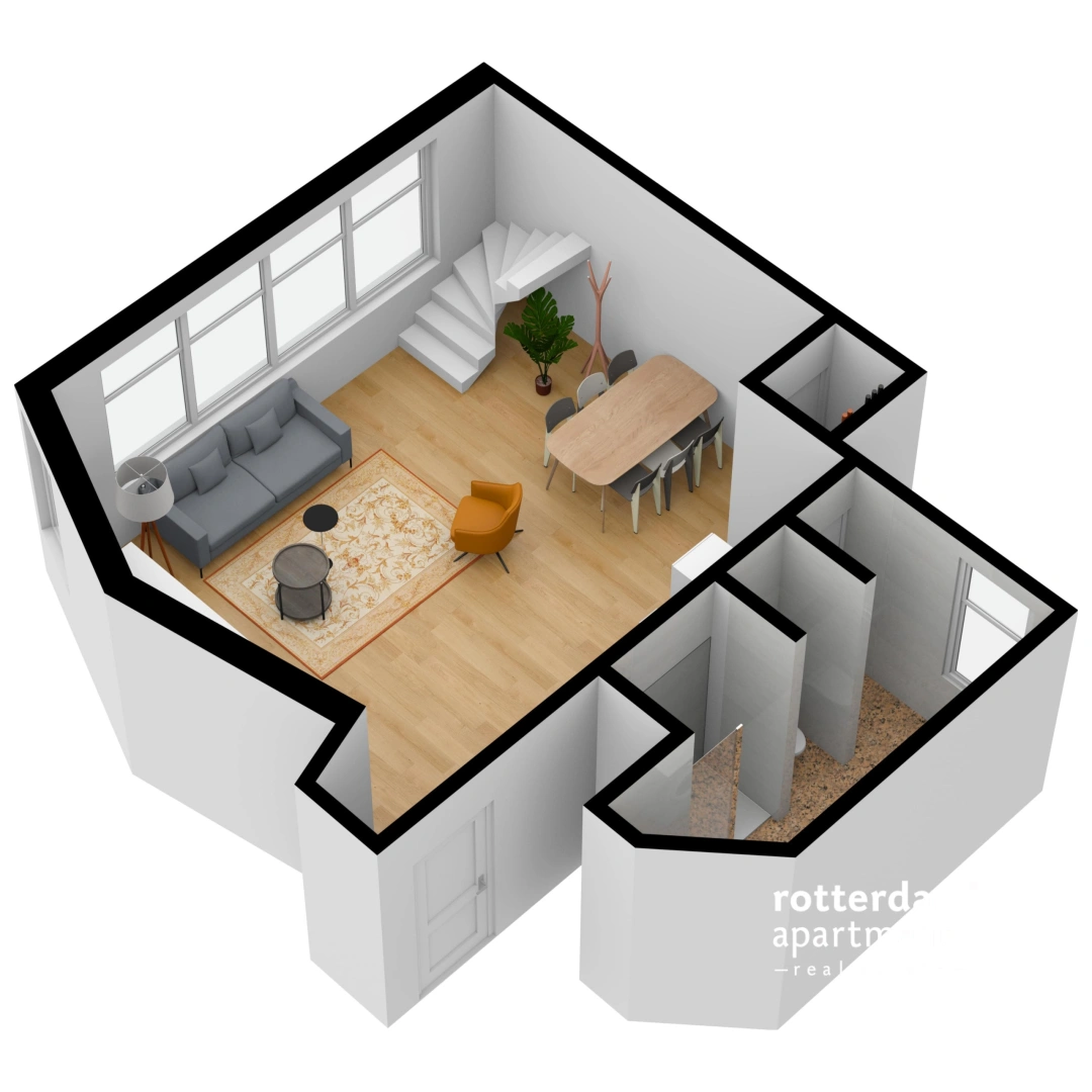 Indeling: Dit appartement is verdeeld over 2 woonlagen, 1e verdieping en een entresol. Entree op de 1e verdieping in de hal, vanuit hier toegang tot de badkamer met toilet en bergkast met was/droogcombinatie. Via de hal toegang tot het woon en eetgedeelte met volledig nieuwe keuken. Via de wenteltrap toegang tot de entresol, waar de slaapkamer te vinden is.