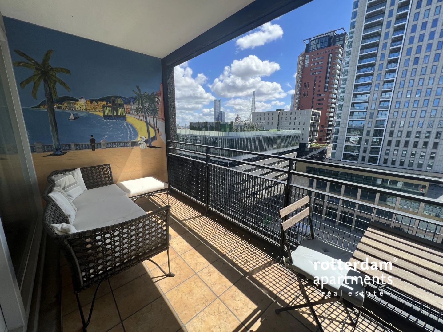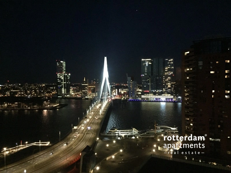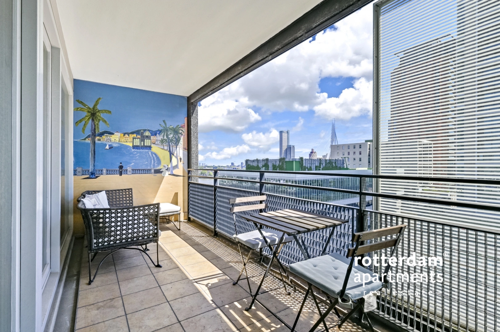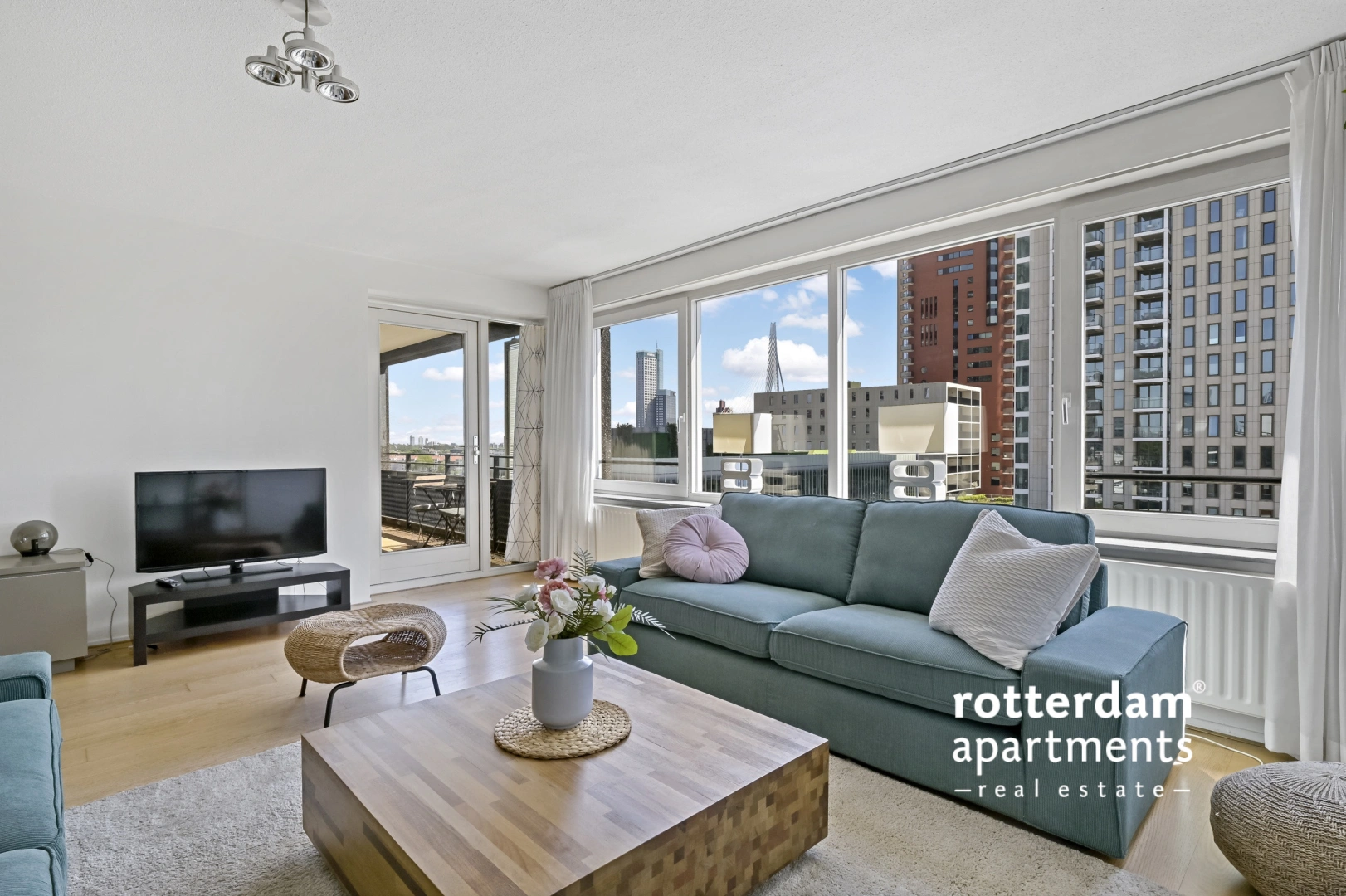 Ggemeubileerd 3 kamer appartement op de 10e verdieping (met optionele gebruik van de beveiligde parkeerplaats) in het centrum van Rotterdam aan de Maas en de beroemde "Erasmusbrug". Op loopafstand van de chique en lokale restaurants, winkels, musea, het "Luxor Theater" en het stadscentrum. Tramlijnen 7, 8, 23 en 25 lopen naar het Centraal Station. Metrostation `Leuvenhaven` welke op loopafstand is gelegen biedt een directe verbinding met Den Haag Centraal.