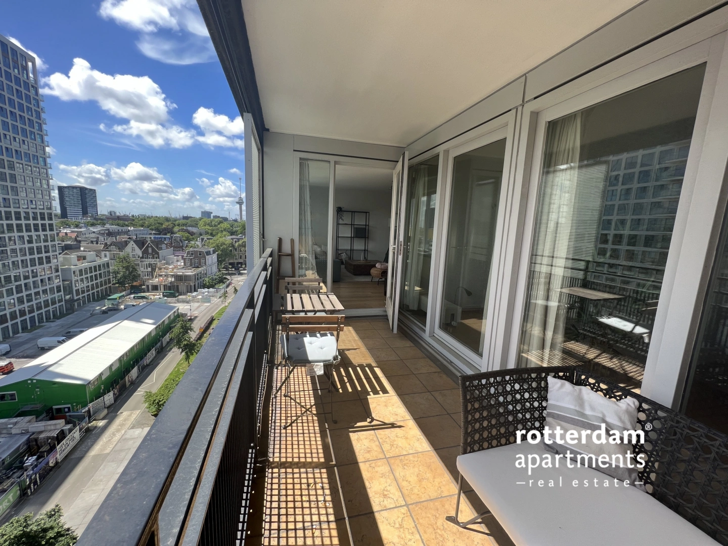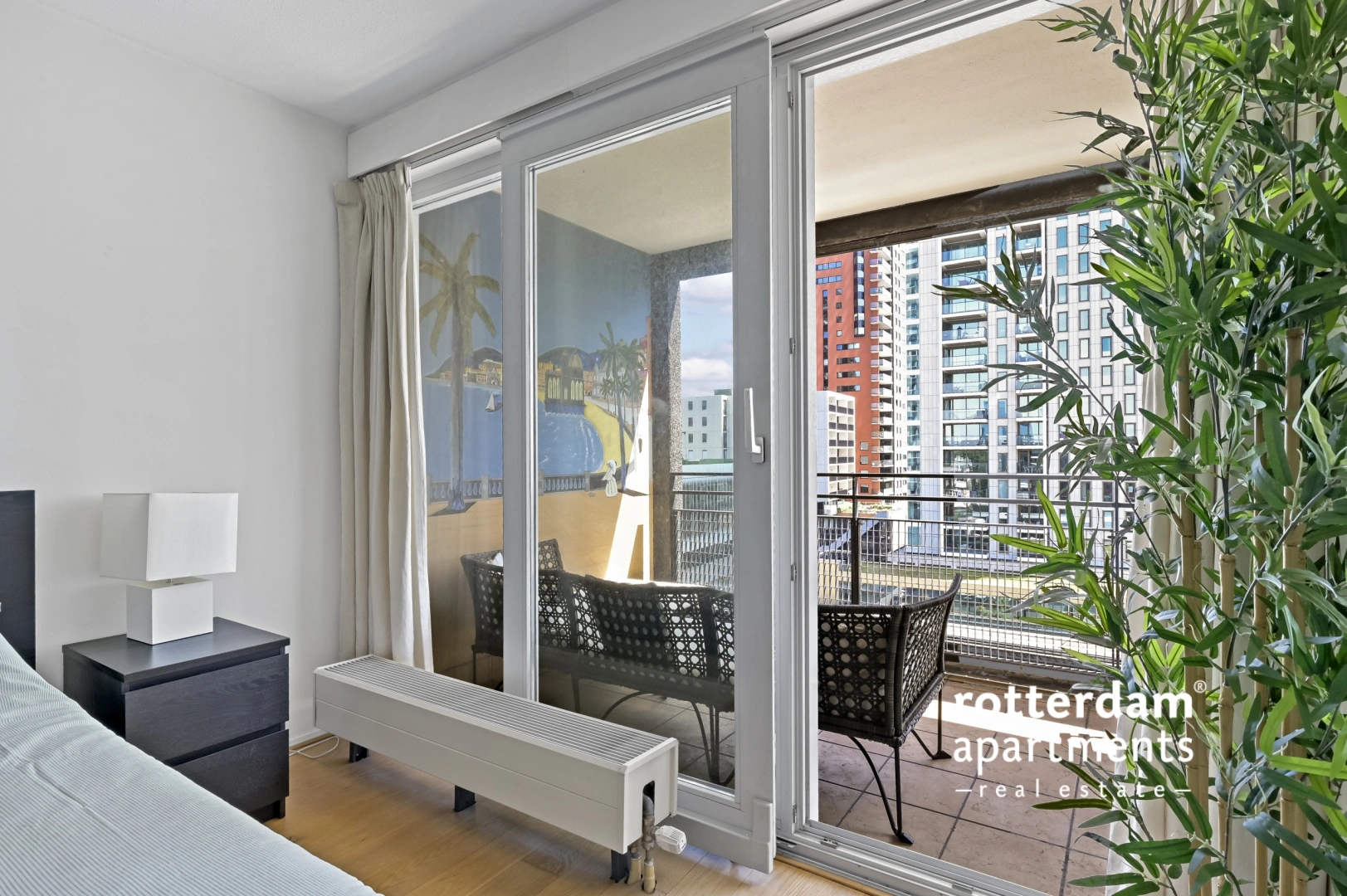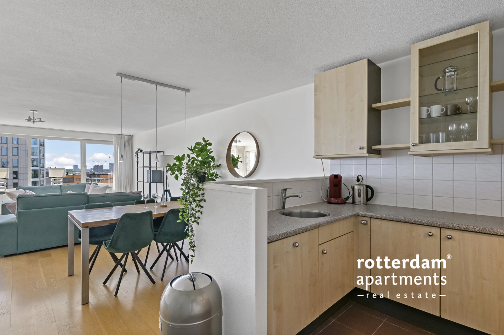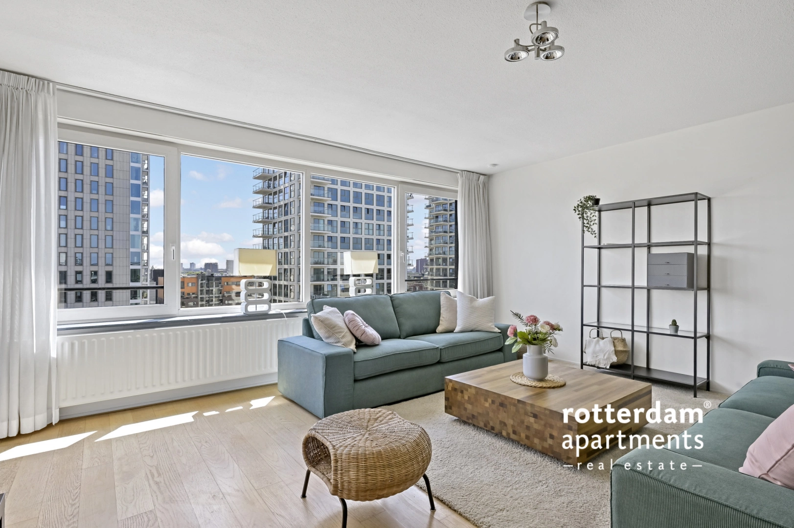 Ggemeubileerd 3 kamer appartement op de 10e verdieping (met optionele gebruik van de beveiligde parkeerplaats) in het centrum van Rotterdam aan de Maas en de beroemde "Erasmusbrug". Op loopafstand van de chique en lokale restaurants, winkels, musea, het "Luxor Theater" en het stadscentrum. Tramlijnen 7, 8, 23 en 25 lopen naar het Centraal Station. Metrostation `Leuvenhaven` welke op loopafstand is gelegen biedt een directe verbinding met Den Haag Centraal.