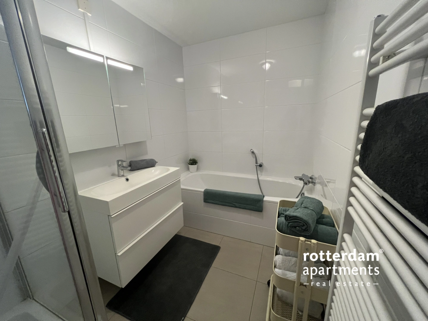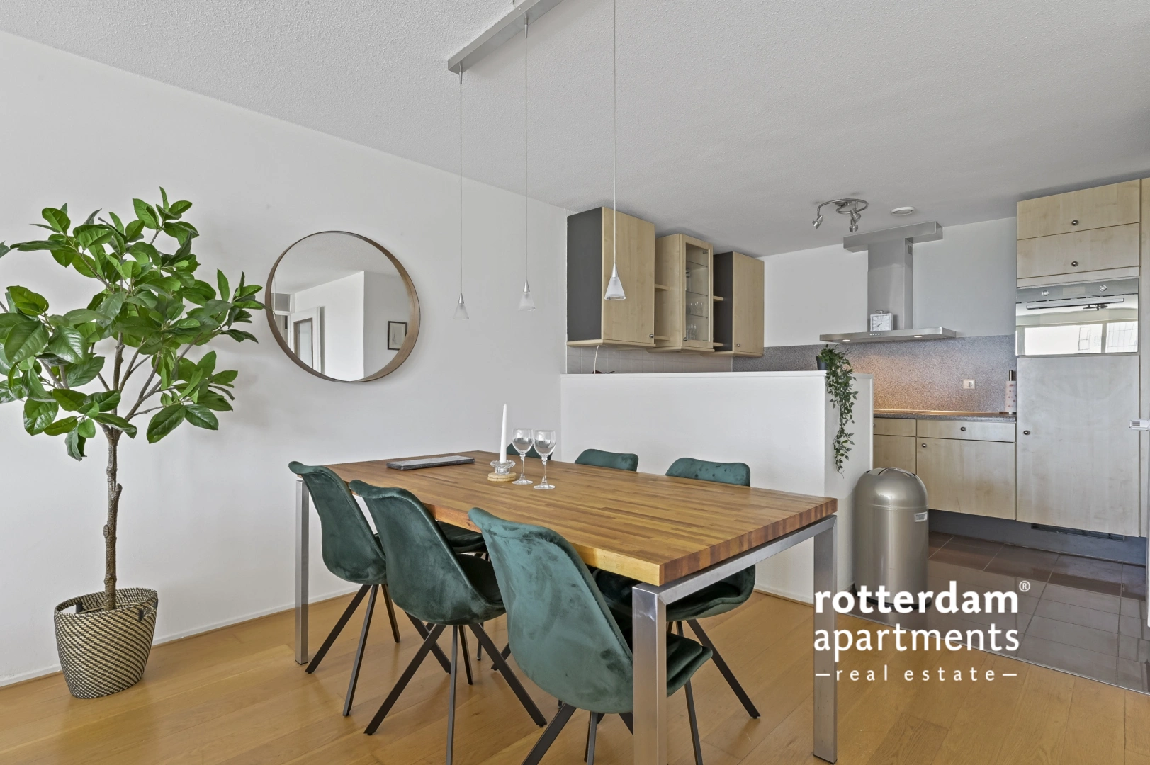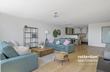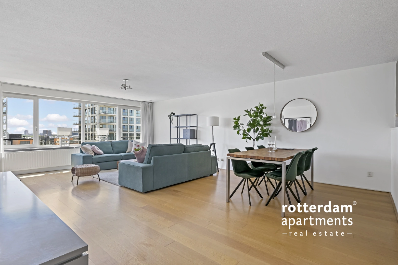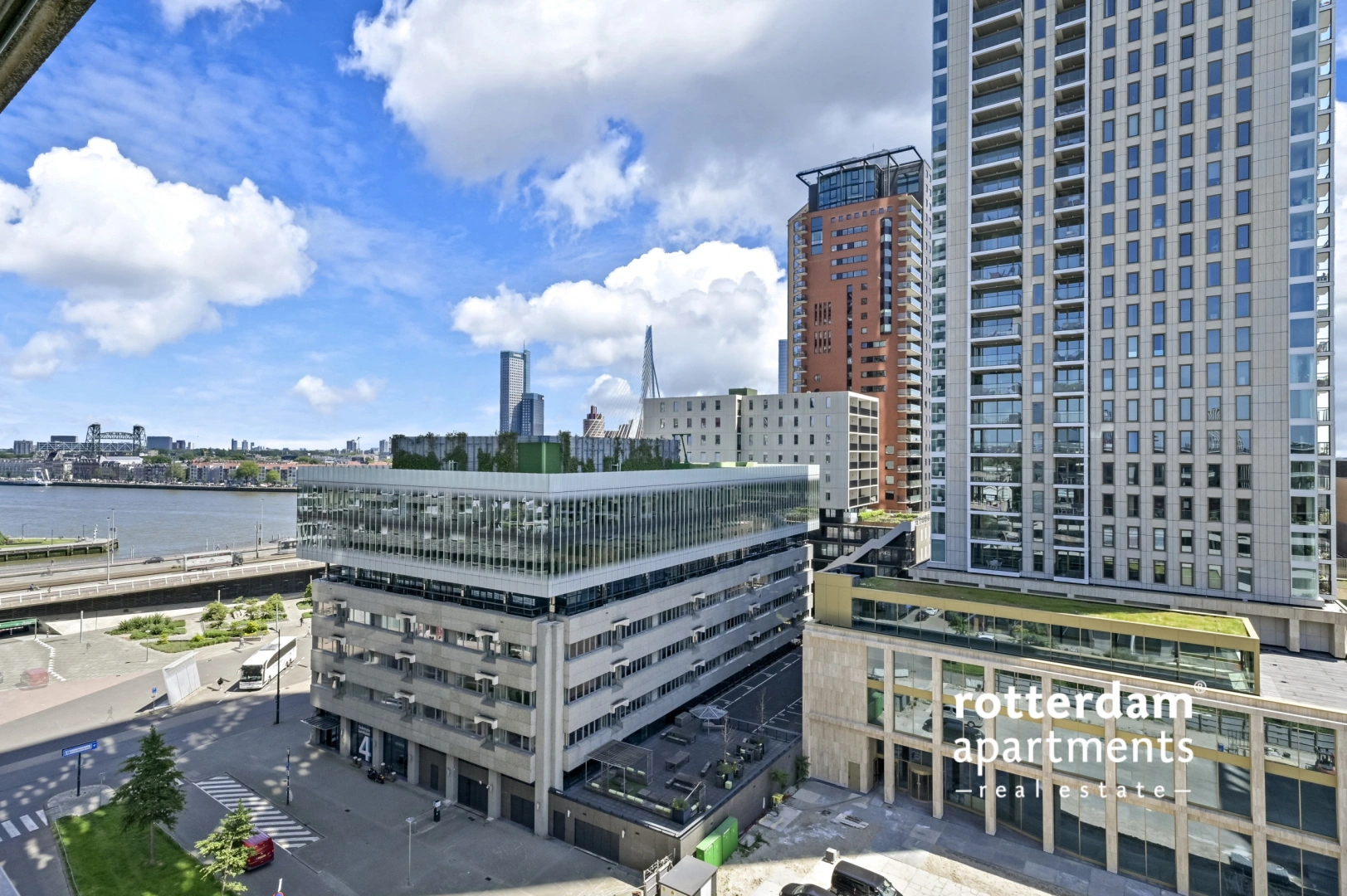 Ggemeubileerd 3 kamer appartement op de 10e verdieping (met optionele gebruik van de beveiligde parkeerplaats) in het centrum van Rotterdam aan de Maas en de beroemde "Erasmusbrug". Op loopafstand van de chique en lokale restaurants, winkels, musea, het "Luxor Theater" en het stadscentrum. Tramlijnen 7, 8, 23 en 25 lopen naar het Centraal Station. Metrostation `Leuvenhaven` welke op loopafstand is gelegen biedt een directe verbinding met Den Haag Centraal.