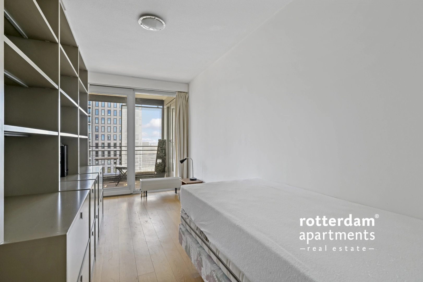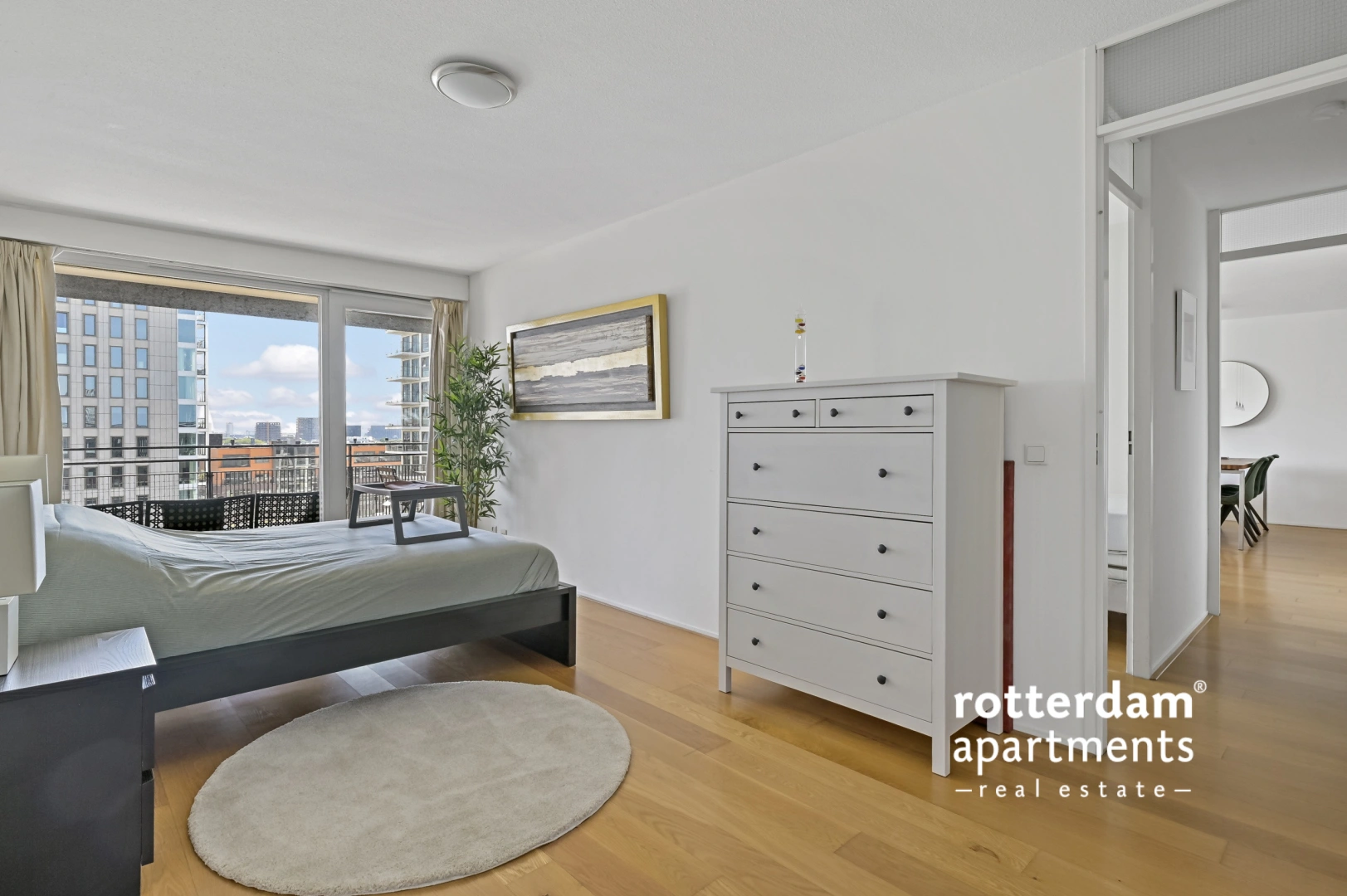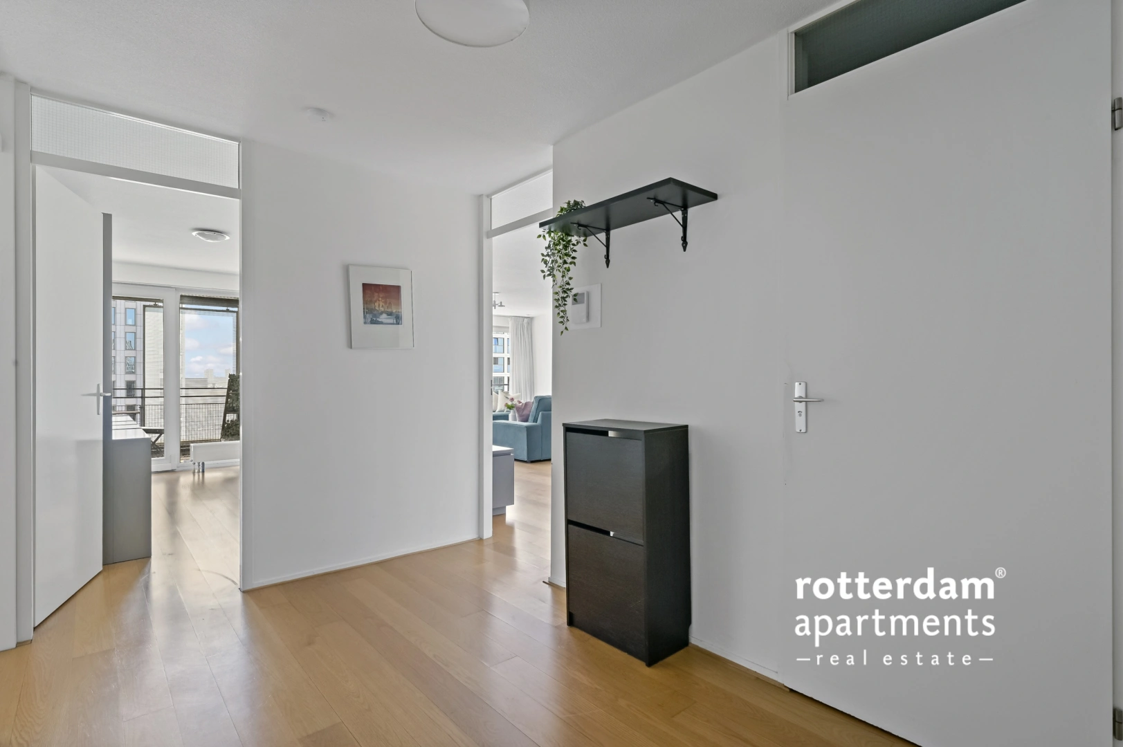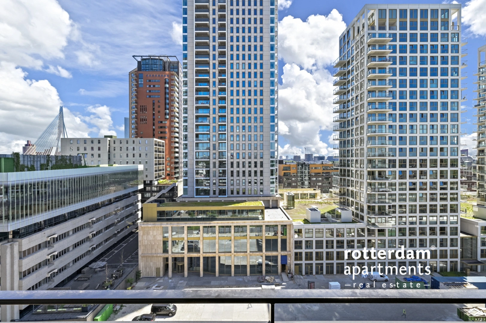 Indeling: Gemeenschappelijke beveiligde entree op de begane grond met beltableau, brievenbussen en toegang tot ruime opslagruimte. 10e verdieping. De ruime hal geeft toegang tot alle vertrekken waaronder het gloednieuwe betegelde toilet. De moderne woonkamer heeft een laminaatvloer en geeft uitzicht over de Erasmusbrug. De woonkamer bied ook toegang tot het balkon welke gelegen is op het zuiden. De open keuken is uitgerust met vele nieuwe apparaten, waaronder een geïntegreerde vaatwasser, magnetron/ oven, koelkast en 4 elektrische kookplaten. Er is een aparte bijkeuken met wasmachine en diepvriezer. De grootste slaapkamer heeft een inbouwkast en bied toegang tot het balkon. De tweede slaapkamer is momenteel ingericht als een kantoor maar kan ook worden ingericht als tweede slaapkamer. De onlangs gerenoveerde betegelde badkamer is voorzien van een ligbad, aparte douche, wastafel met spiegel en kastruimte.