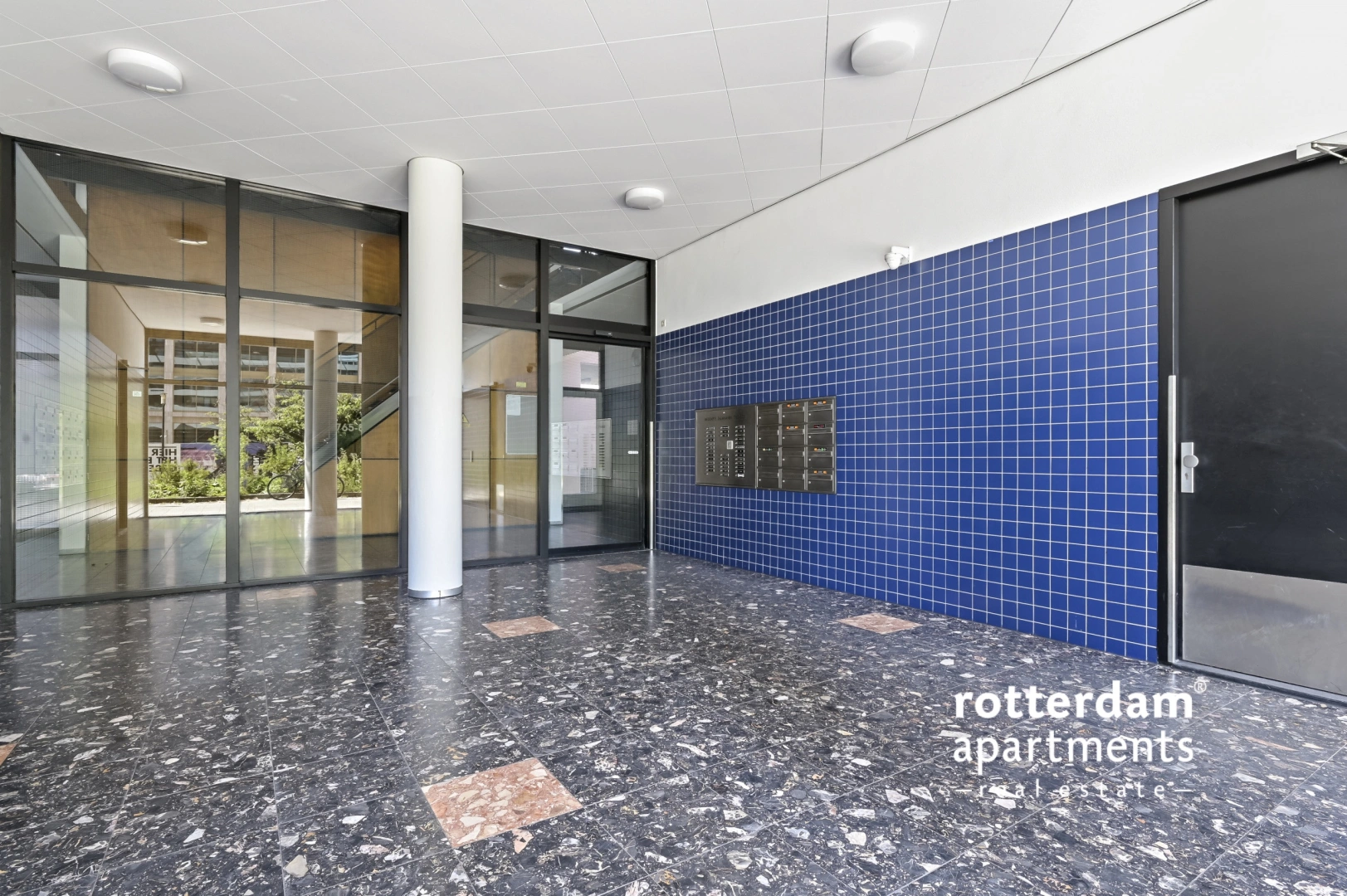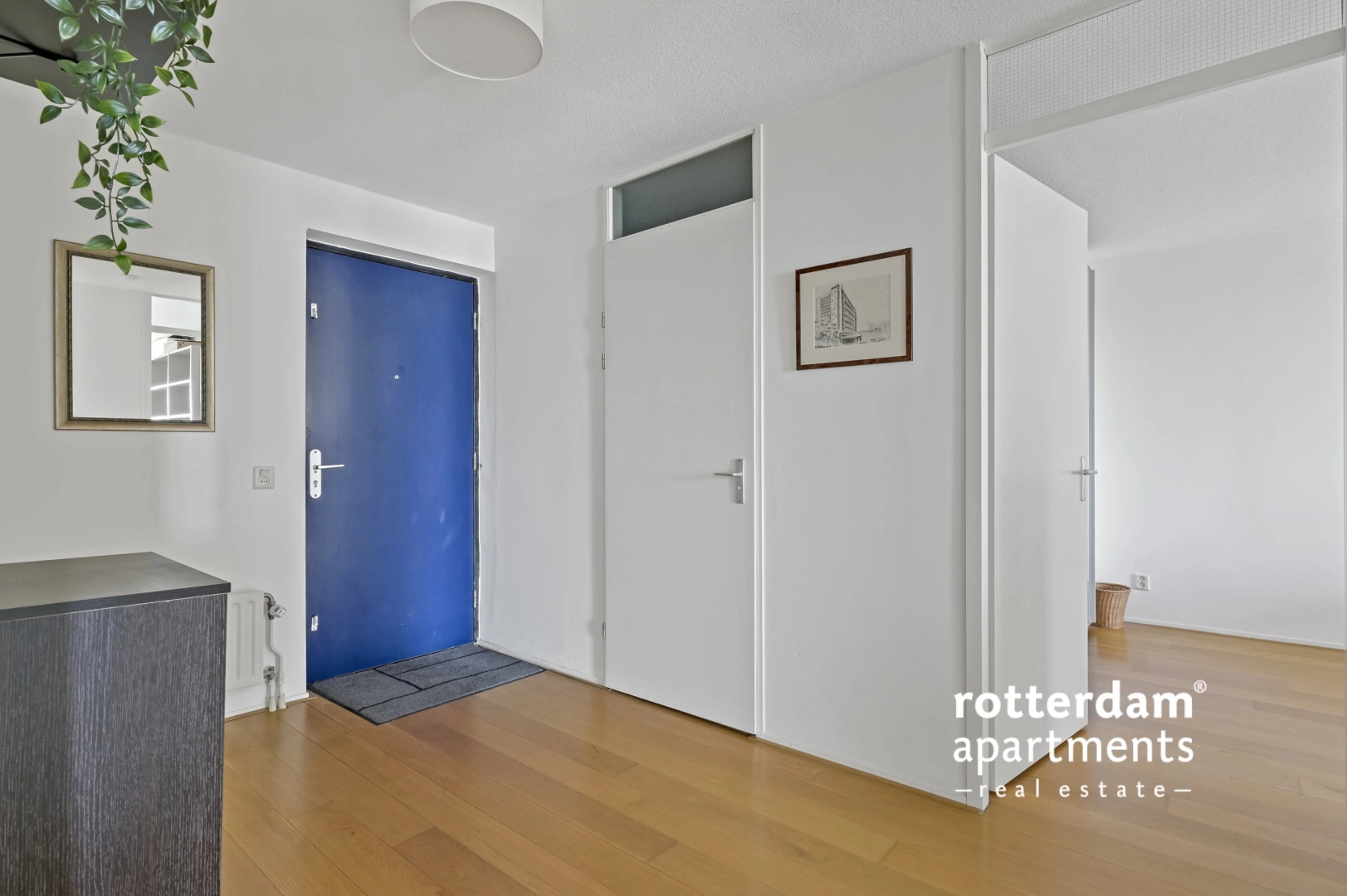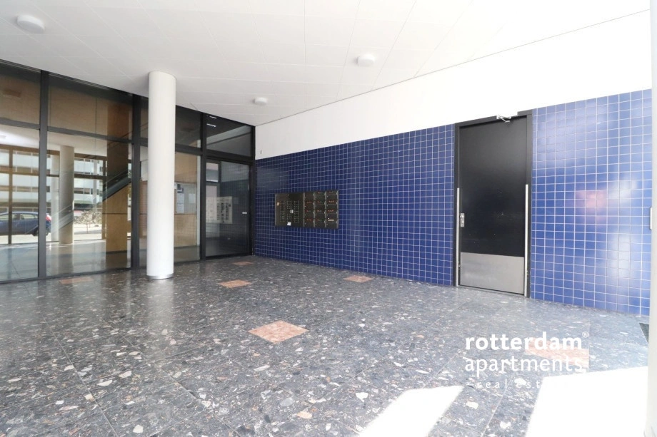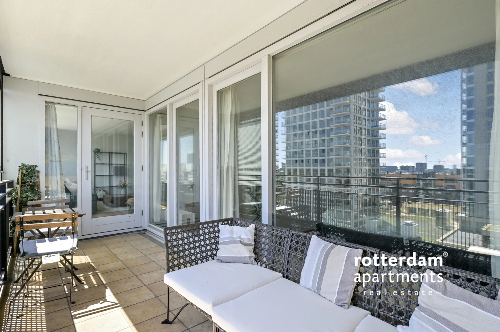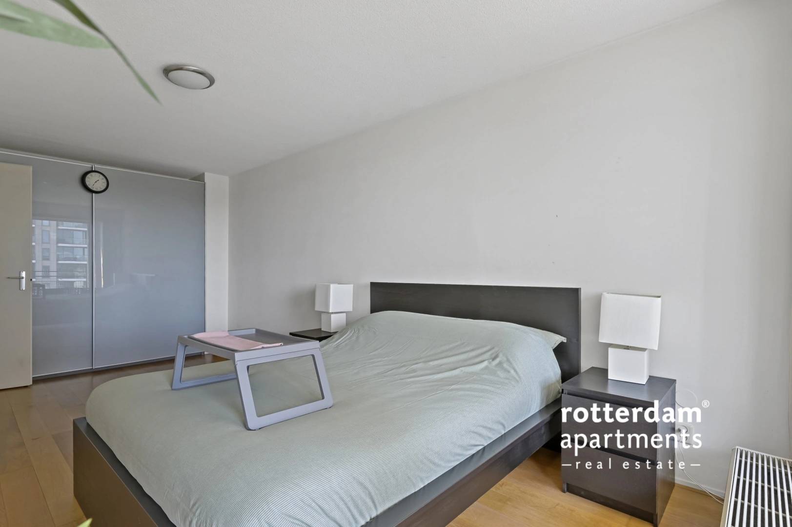 Indeling: Gemeenschappelijke beveiligde entree op de begane grond met beltableau, brievenbussen en toegang tot ruime opslagruimte. 10e verdieping. De ruime hal geeft toegang tot alle vertrekken waaronder het gloednieuwe betegelde toilet. De moderne woonkamer heeft een laminaatvloer en geeft uitzicht over de Erasmusbrug. De woonkamer bied ook toegang tot het balkon welke gelegen is op het zuiden. De open keuken is uitgerust met vele nieuwe apparaten, waaronder een geïntegreerde vaatwasser, magnetron/ oven, koelkast en 4 elektrische kookplaten. Er is een aparte bijkeuken met wasmachine en diepvriezer. De grootste slaapkamer heeft een inbouwkast en bied toegang tot het balkon. De tweede slaapkamer is momenteel ingericht als een kantoor maar kan ook worden ingericht als tweede slaapkamer. De onlangs gerenoveerde betegelde badkamer is voorzien van een ligbad, aparte douche, wastafel met spiegel en kastruimte.