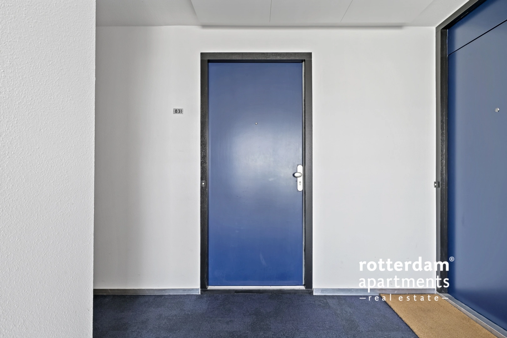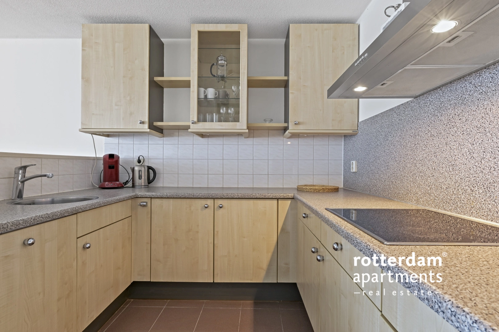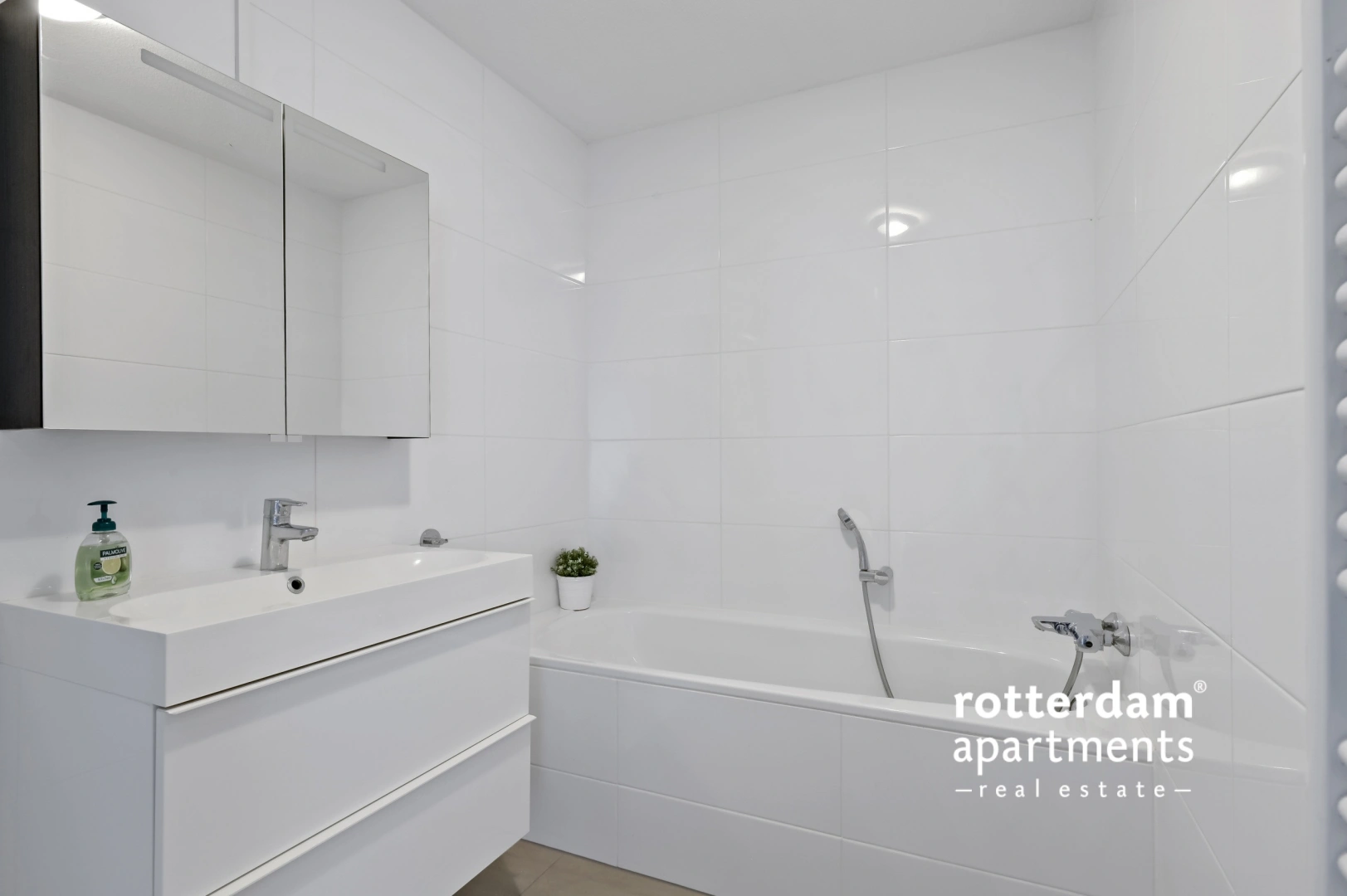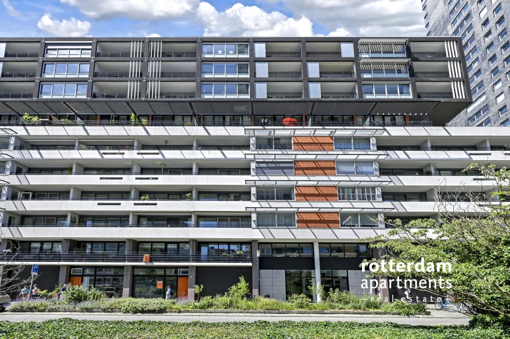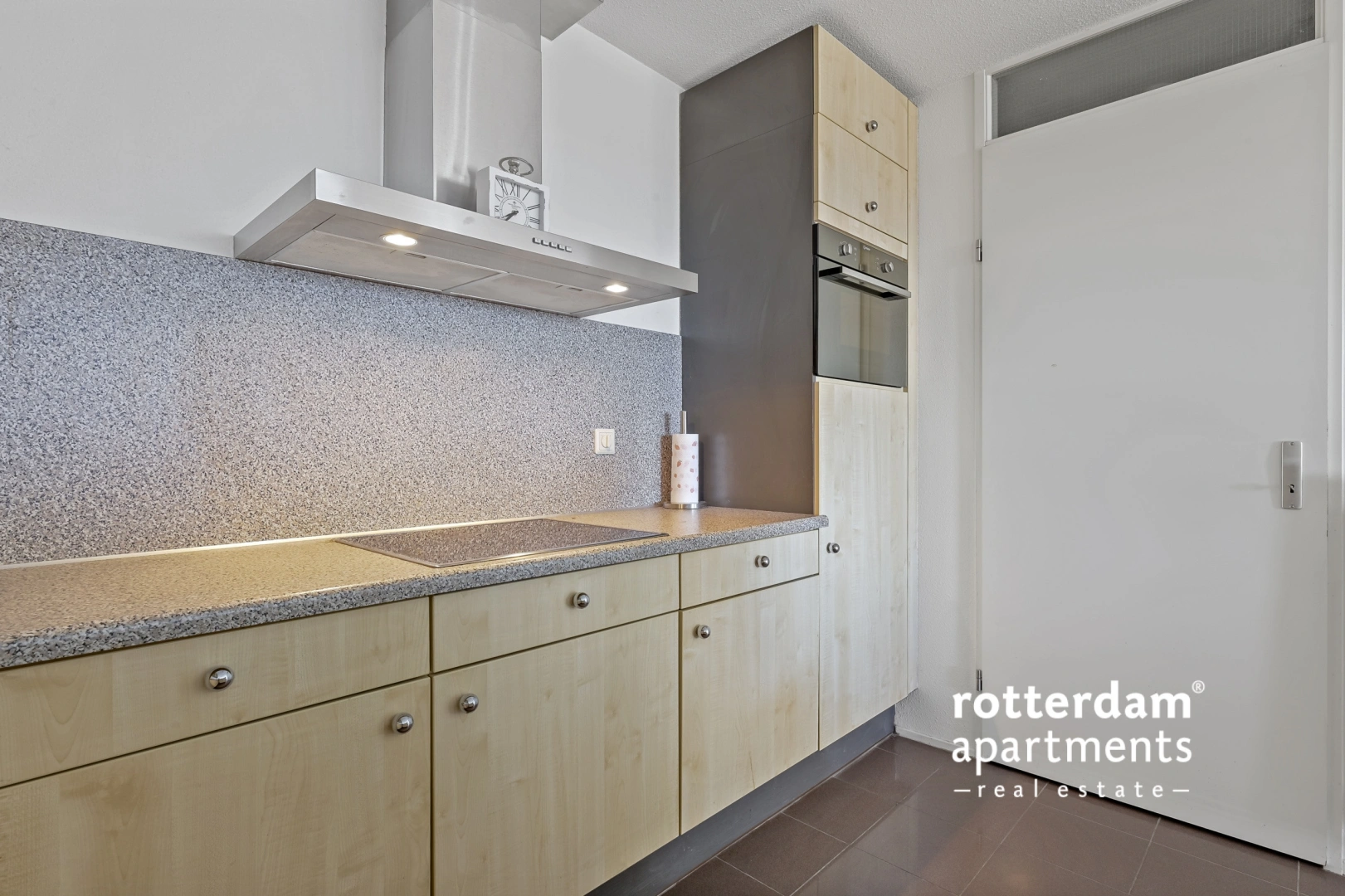 Indeling: Gemeenschappelijke beveiligde entree op de begane grond met beltableau, brievenbussen en toegang tot ruime opslagruimte. 10e verdieping. De ruime hal geeft toegang tot alle vertrekken waaronder het gloednieuwe betegelde toilet. De moderne woonkamer heeft een laminaatvloer en geeft uitzicht over de Erasmusbrug. De woonkamer bied ook toegang tot het balkon welke gelegen is op het zuiden. De open keuken is uitgerust met vele nieuwe apparaten, waaronder een geïntegreerde vaatwasser, magnetron/ oven, koelkast en 4 elektrische kookplaten. Er is een aparte bijkeuken met wasmachine en diepvriezer. De grootste slaapkamer heeft een inbouwkast en bied toegang tot het balkon. De tweede slaapkamer is momenteel ingericht als een kantoor maar kan ook worden ingericht als tweede slaapkamer. De onlangs gerenoveerde betegelde badkamer is voorzien van een ligbad, aparte douche, wastafel met spiegel en kastruimte.