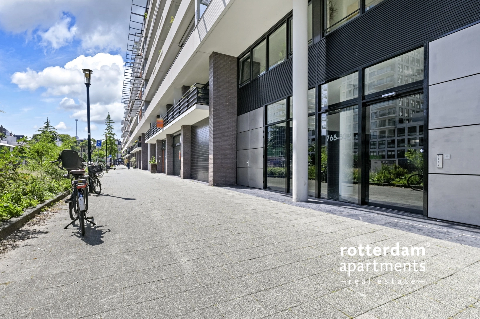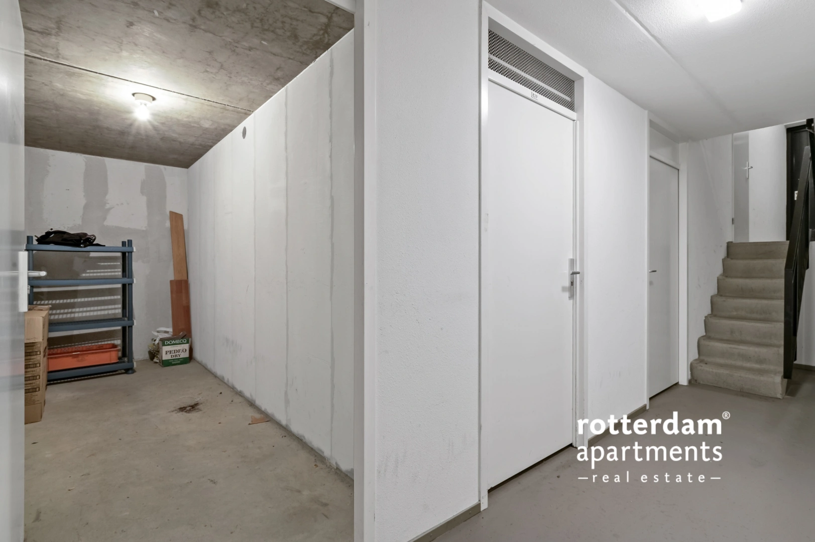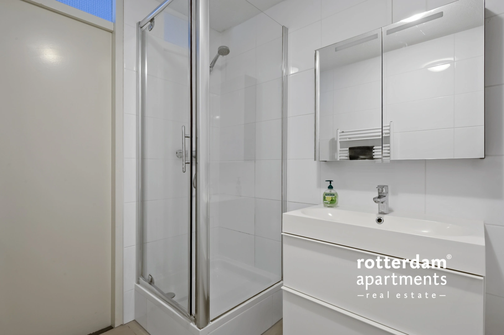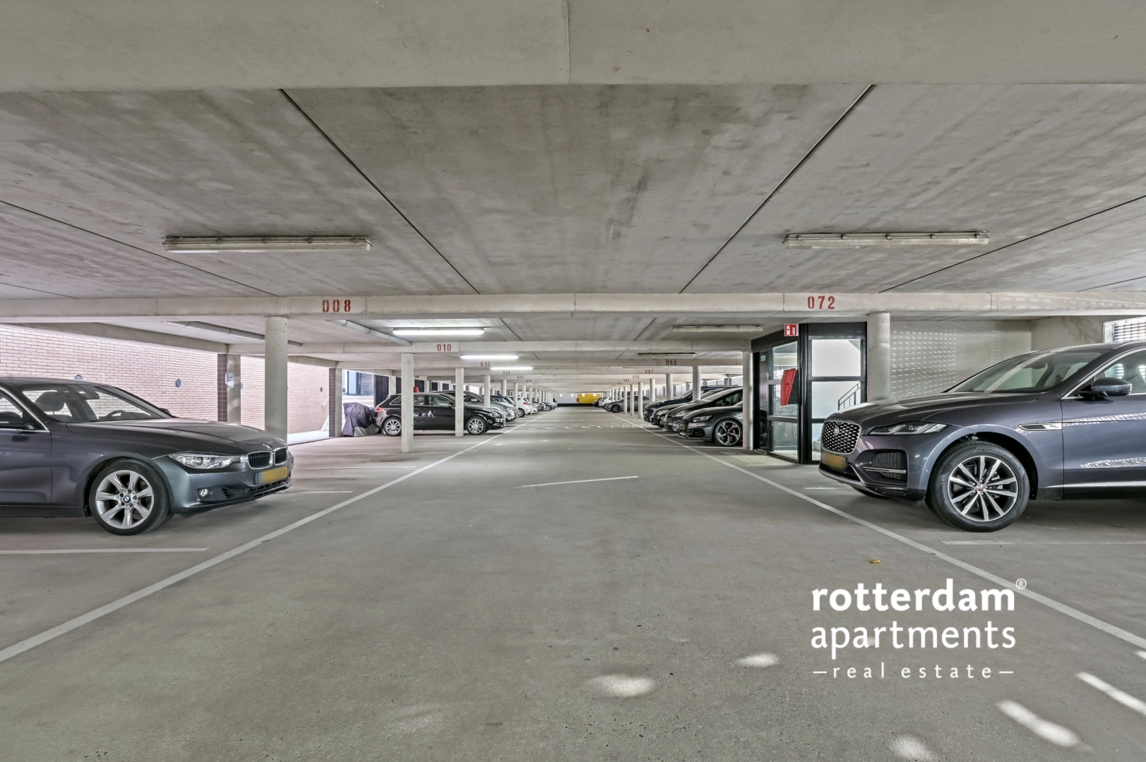 Indeling: Gemeenschappelijke beveiligde entree op de begane grond met beltableau, brievenbussen en toegang tot ruime opslagruimte. 10e verdieping. De ruime hal geeft toegang tot alle vertrekken waaronder het gloednieuwe betegelde toilet. De moderne woonkamer heeft een laminaatvloer en geeft uitzicht over de Erasmusbrug. De woonkamer bied ook toegang tot het balkon welke gelegen is op het zuiden. De open keuken is uitgerust met vele nieuwe apparaten, waaronder een geïntegreerde vaatwasser, magnetron/ oven, koelkast en 4 elektrische kookplaten. Er is een aparte bijkeuken met wasmachine en diepvriezer. De grootste slaapkamer heeft een inbouwkast en bied toegang tot het balkon. De tweede slaapkamer is momenteel ingericht als een kantoor maar kan ook worden ingericht als tweede slaapkamer. De onlangs gerenoveerde betegelde badkamer is voorzien van een ligbad, aparte douche, wastafel met spiegel en kastruimte.