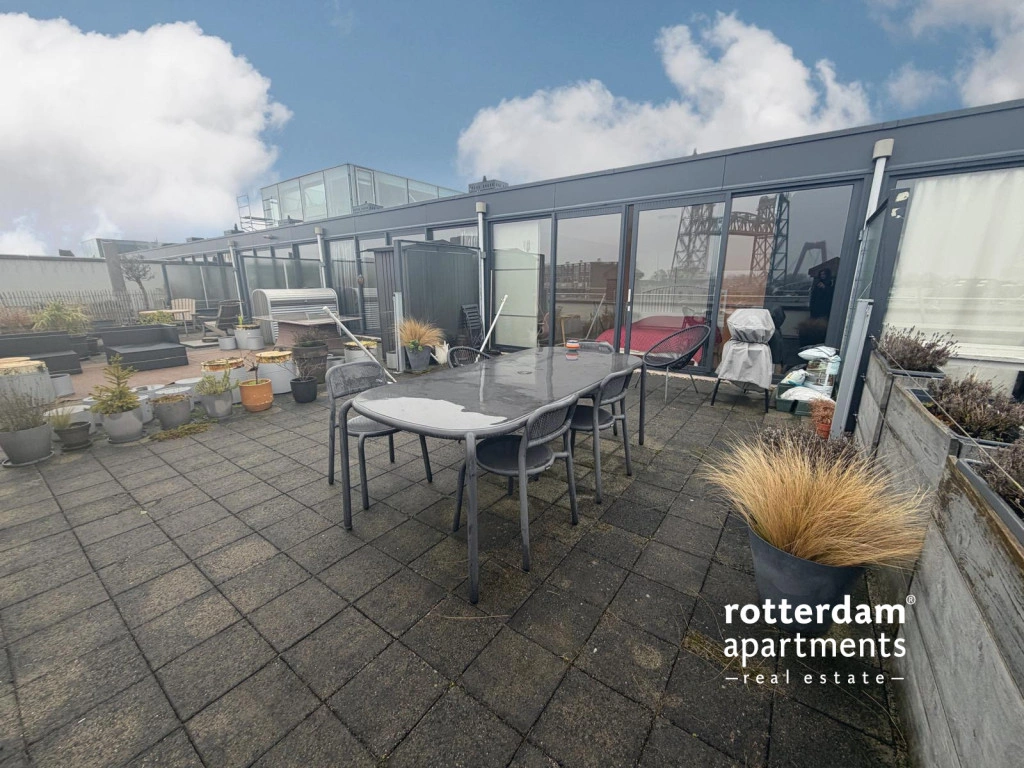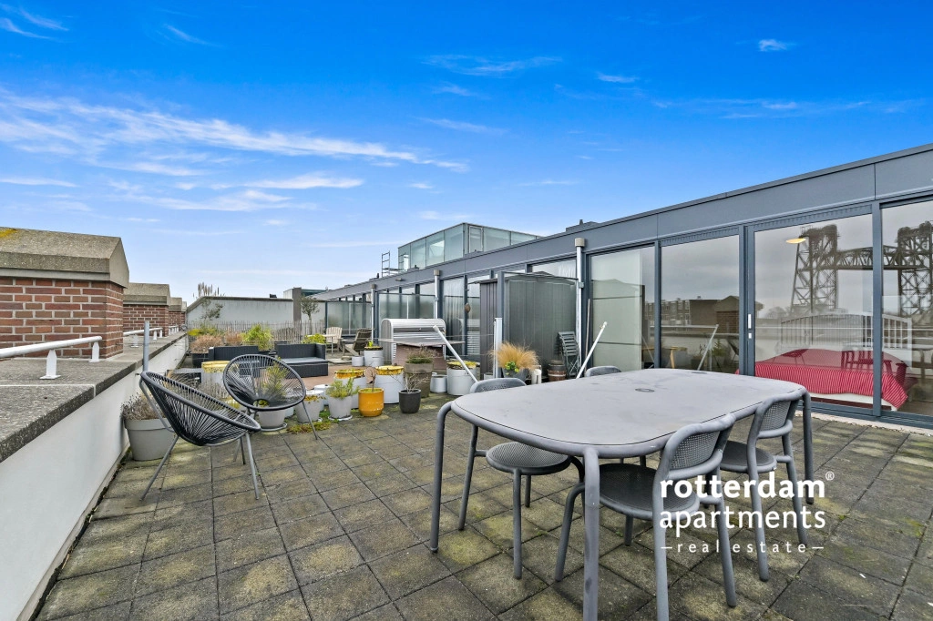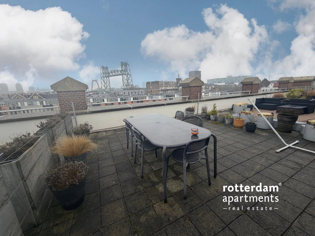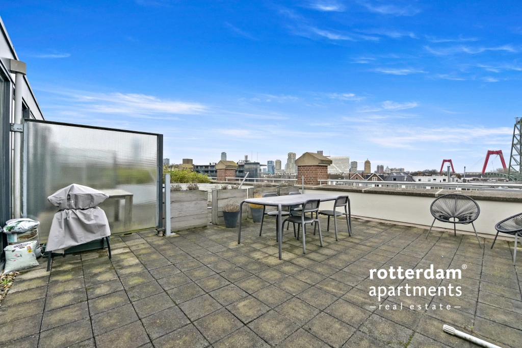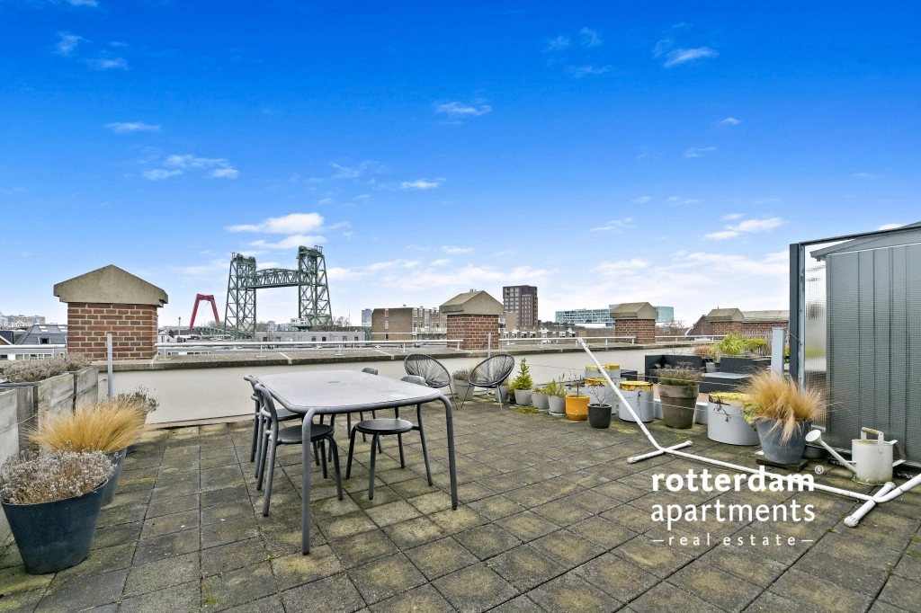 dakterras met uitzicht op de skyline van Rotterdam.