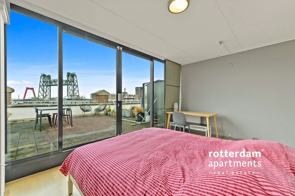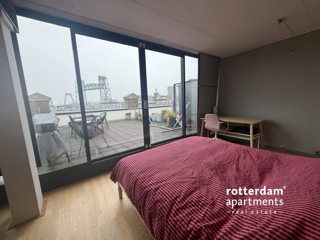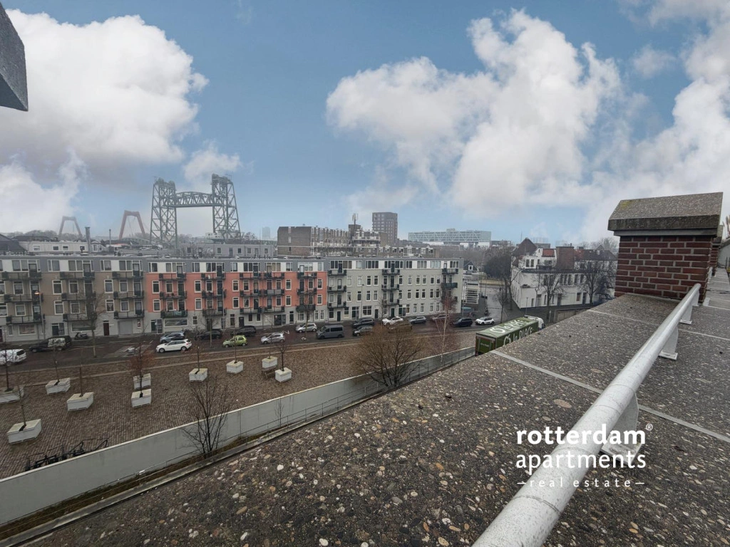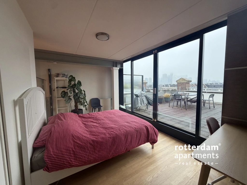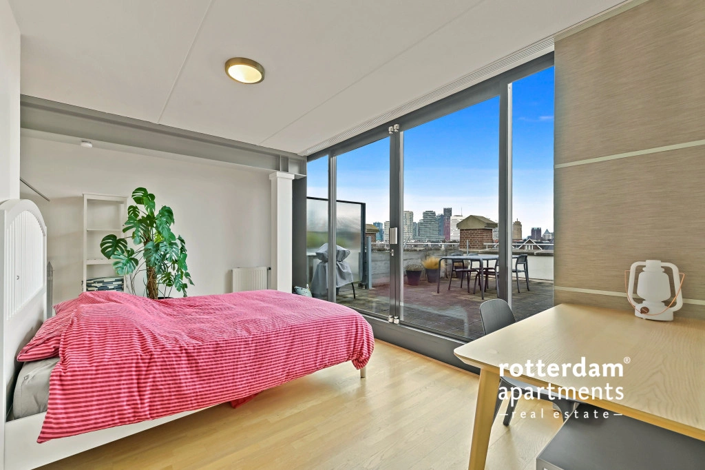dakterras met uitzicht op de skyline van Rotterdam.