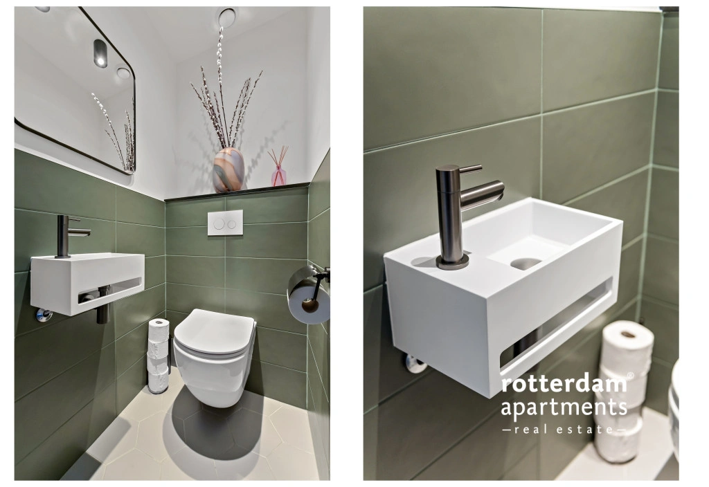 wastafels met meubel en 2 spiegels. Vanaf de badkamer bereikt u de aparte
