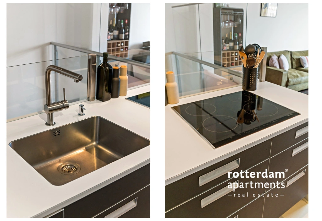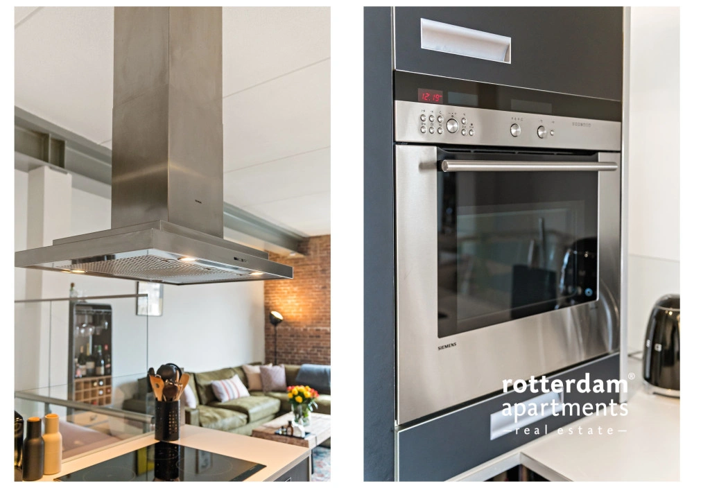 inductiekookplaat, vaatwasser, oven, magnetron, koelkast en vriezer.