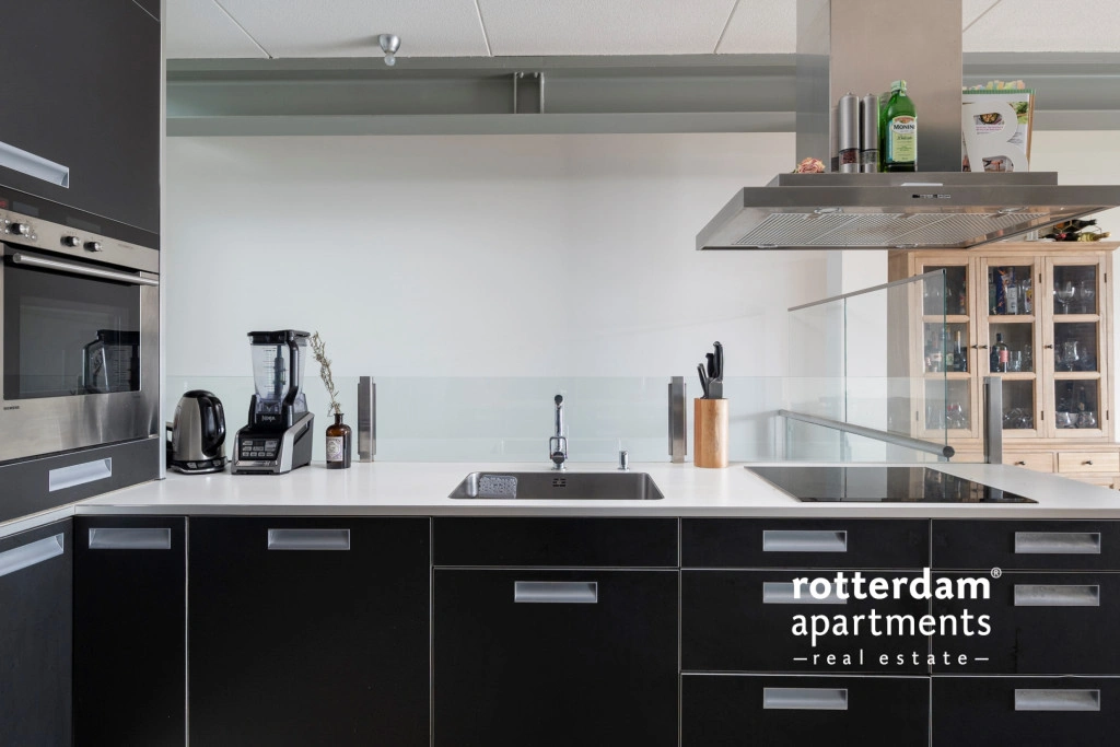 en open keuken scheiden. De keuken is erg ruim en uitgerust met zwarte kastjes