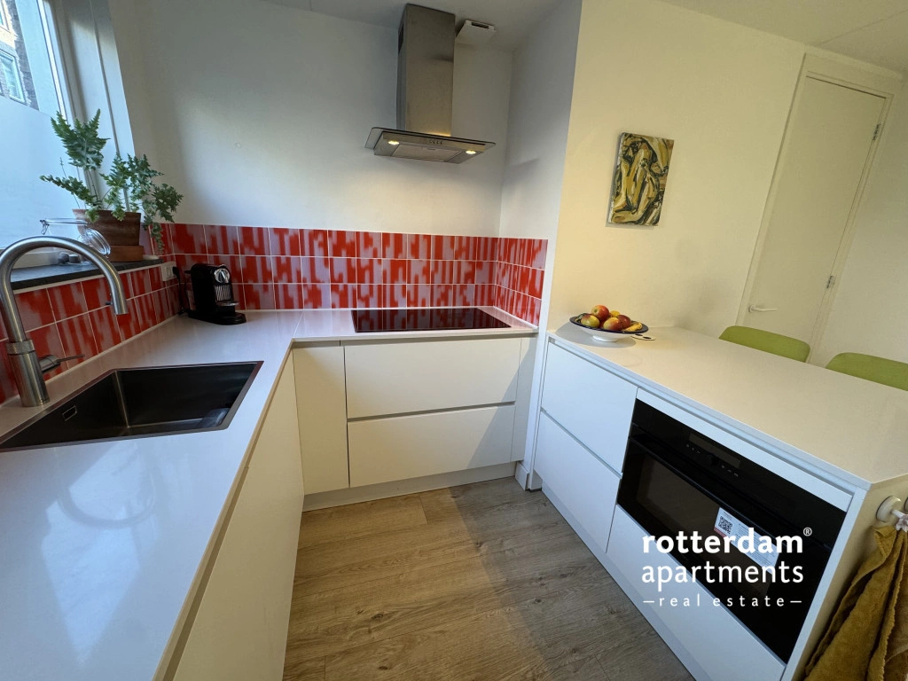 De moderne open keuken bevindt zich aan de voorzijde en is uitgevoerd in een witte hoogglans afwerking. De keuken is voorzien van een koelkast met vriezer, vaatwasser, inductiekookplaat, afzuigkap en een bar met twee zitplaatsen.