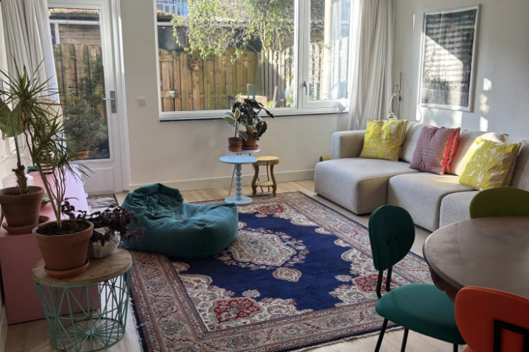De woonkamer ligt aan de achterzijde van de woning en is sfeervol ingericht met een comfortabele bank, vloerkleed, salontafels en een ronde eettafel met stoelen. De ruimte is licht en geeft direct toegang tot de heerlijke achtertuin met achterom.