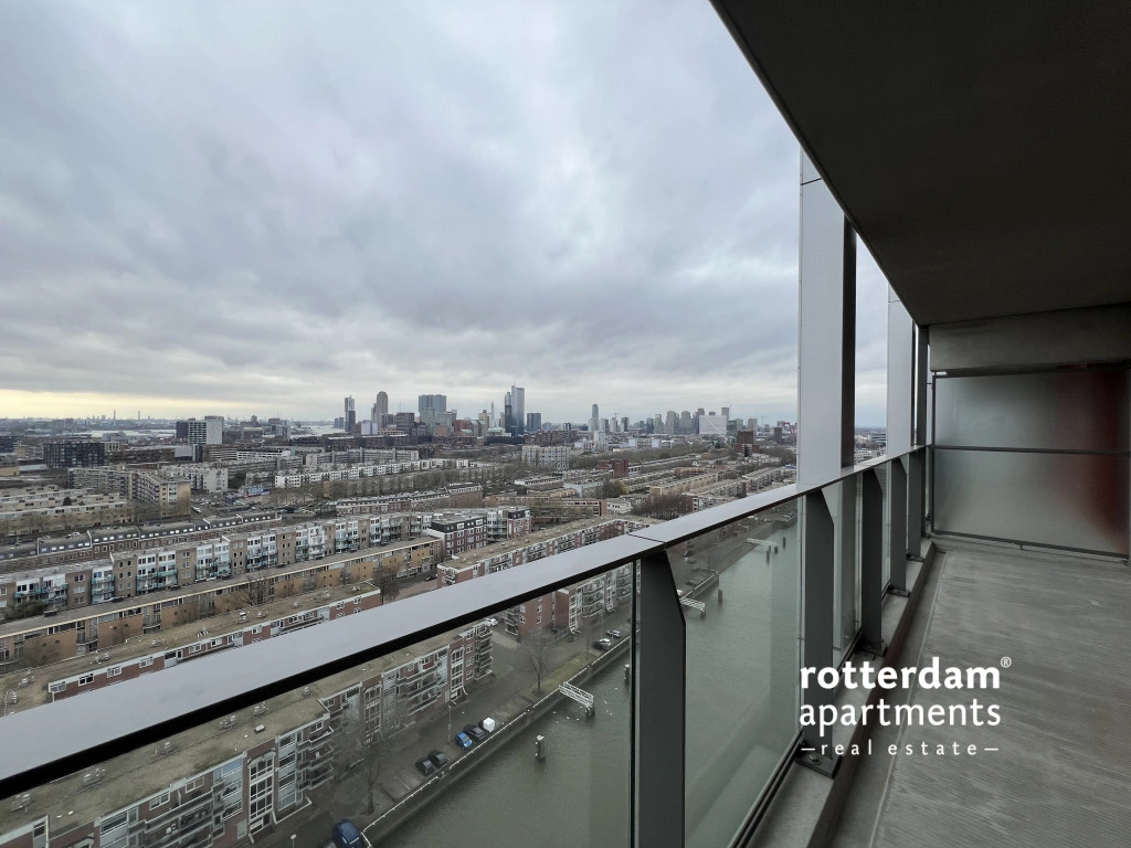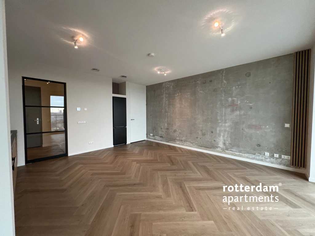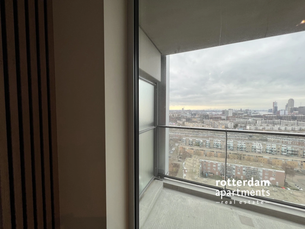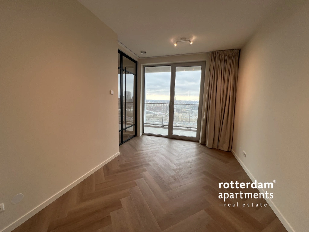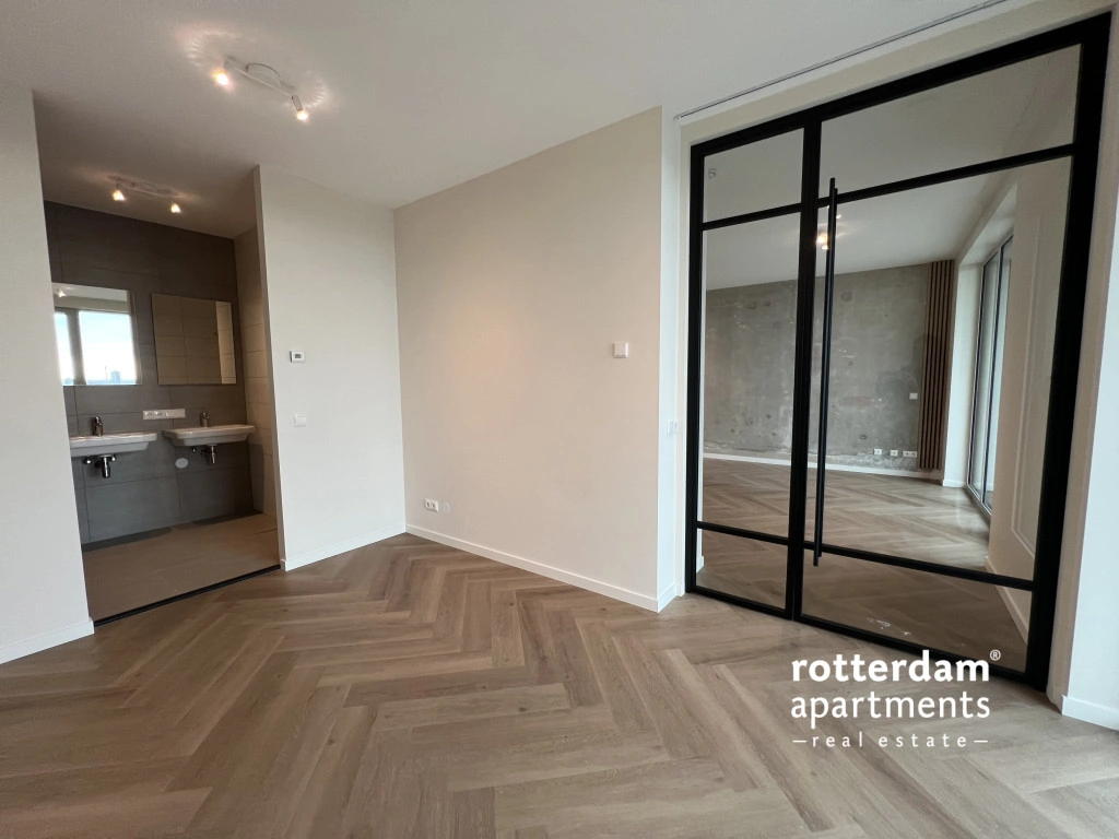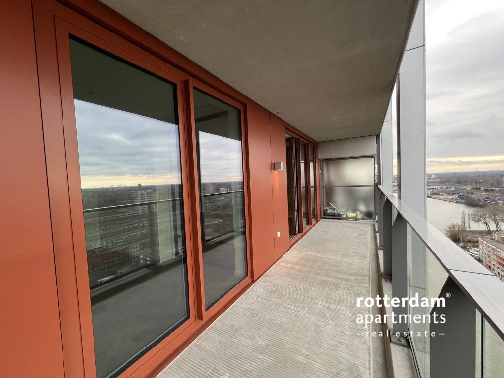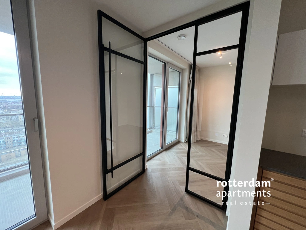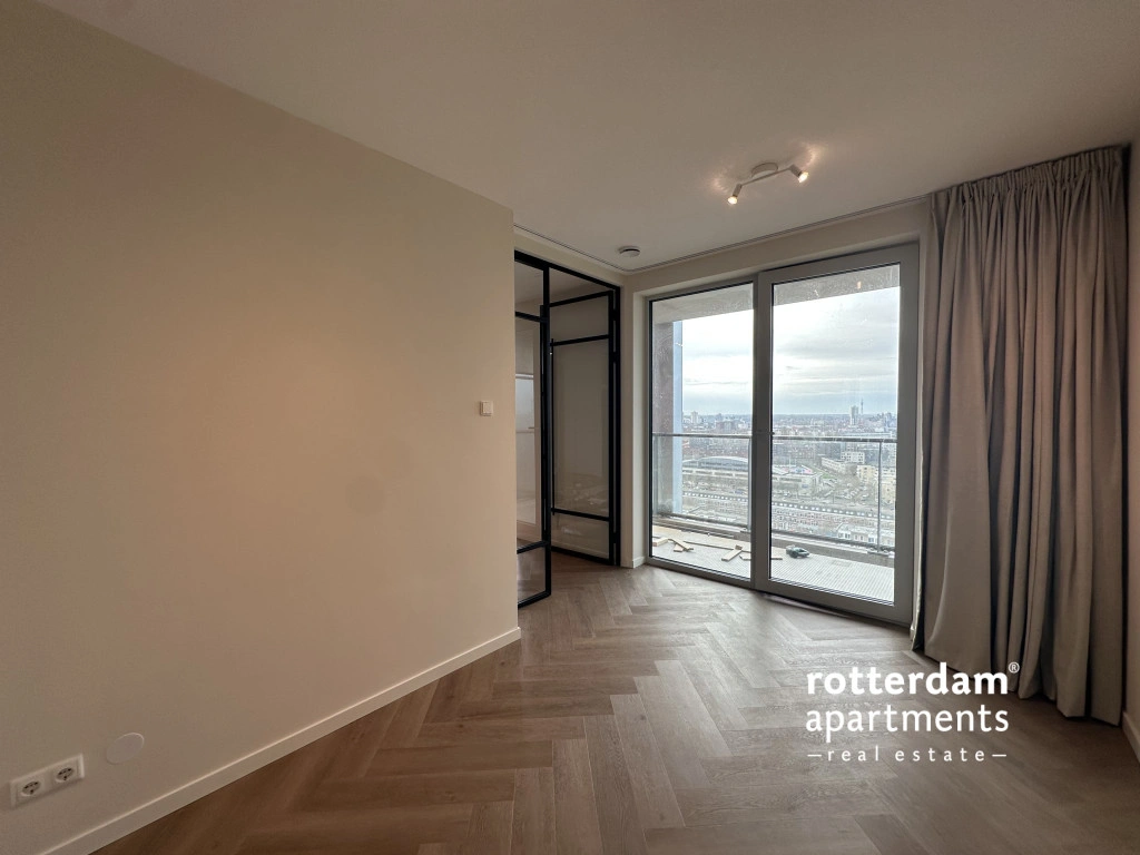 Zowel de woonkamer als de slaapkamer bieden directe toegang tot het brede balkon met uitzicht over de skyline van Rotterdam.