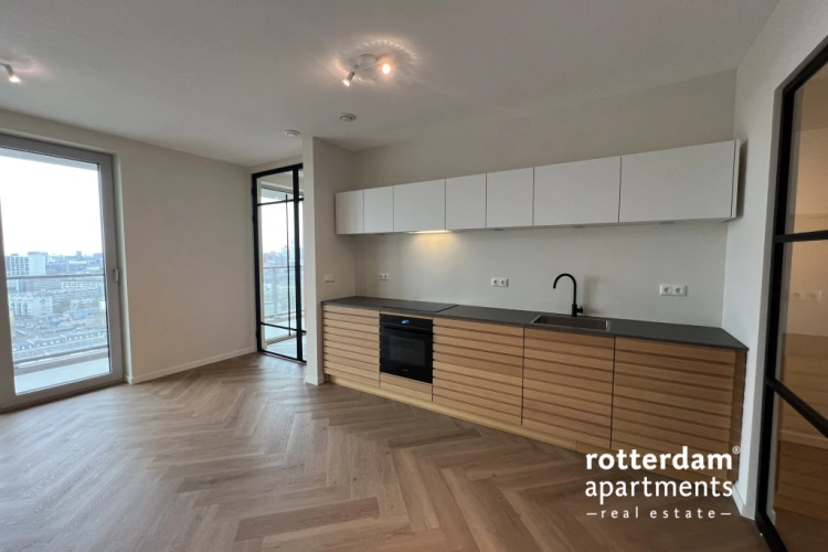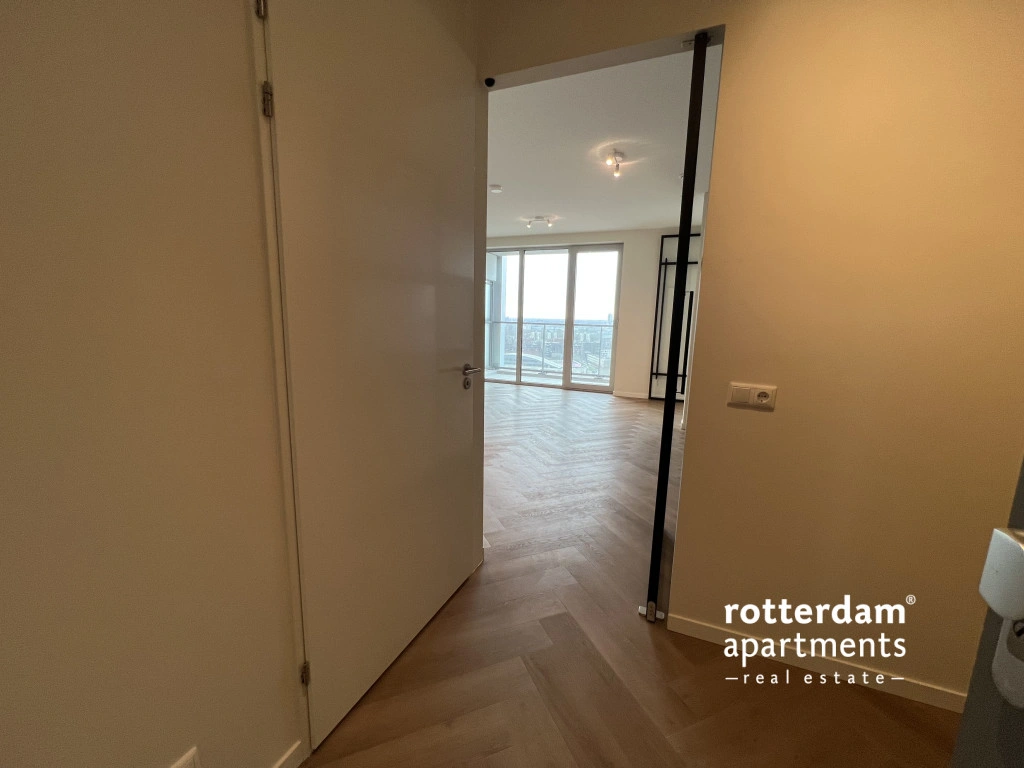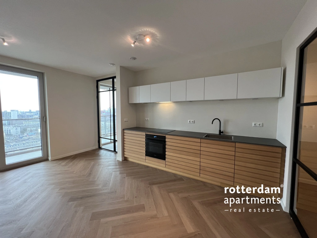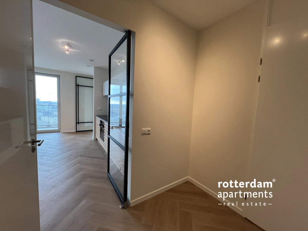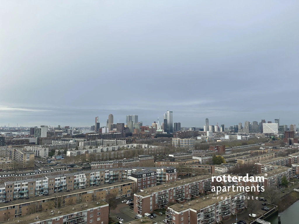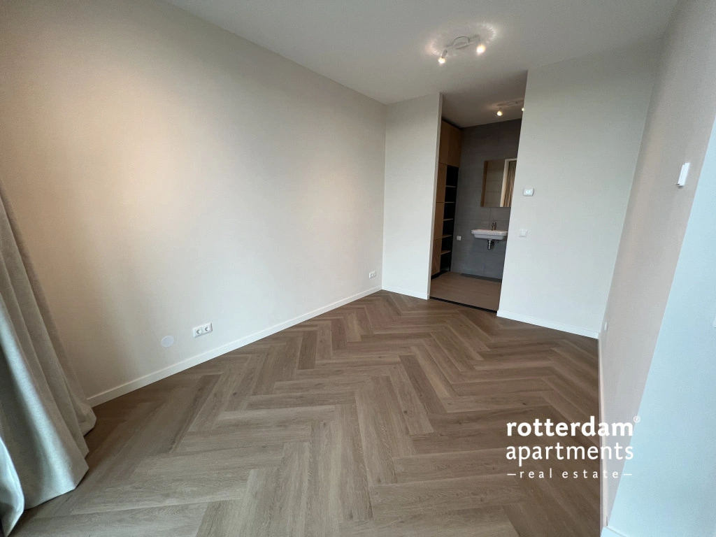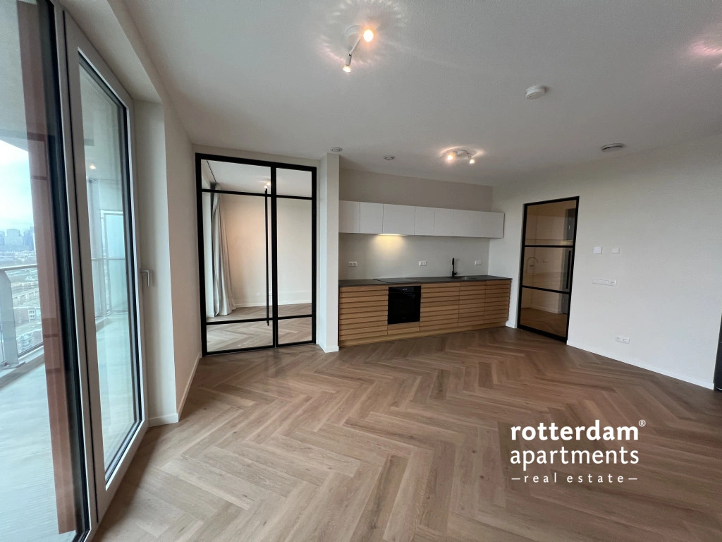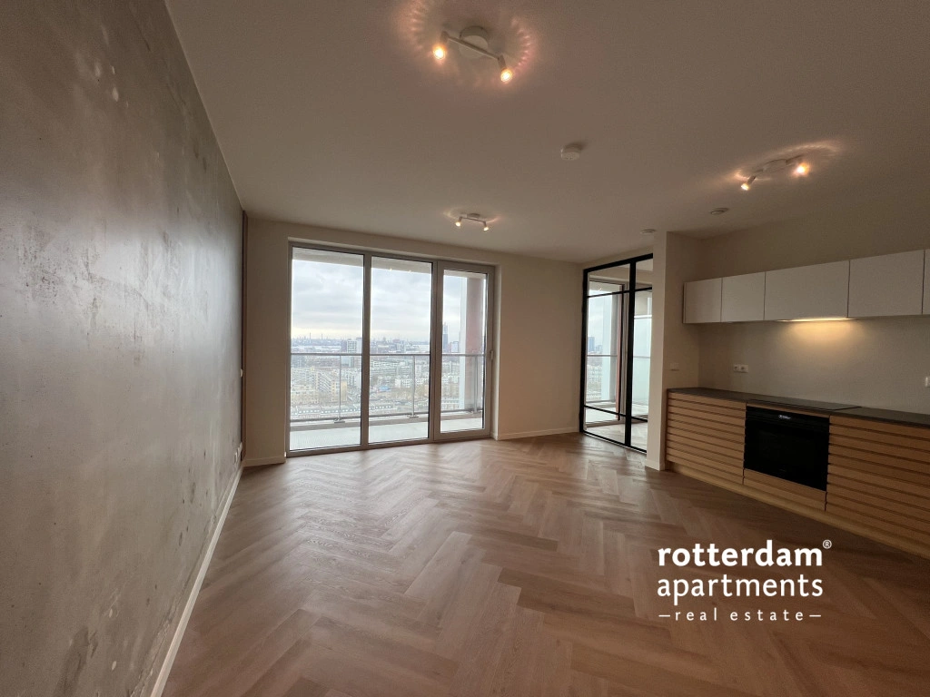 Zowel de woonkamer als de slaapkamer bieden directe toegang tot het brede balkon met uitzicht over de skyline van Rotterdam.