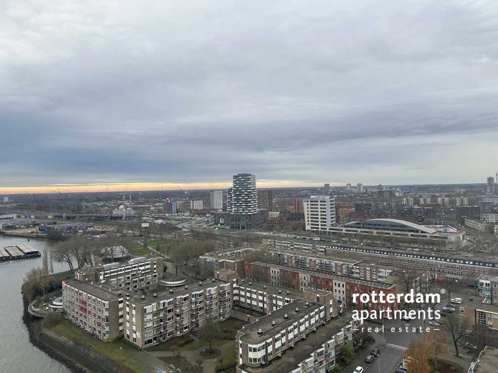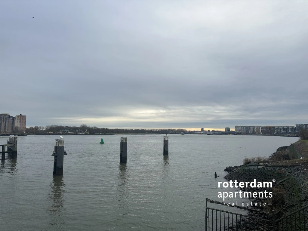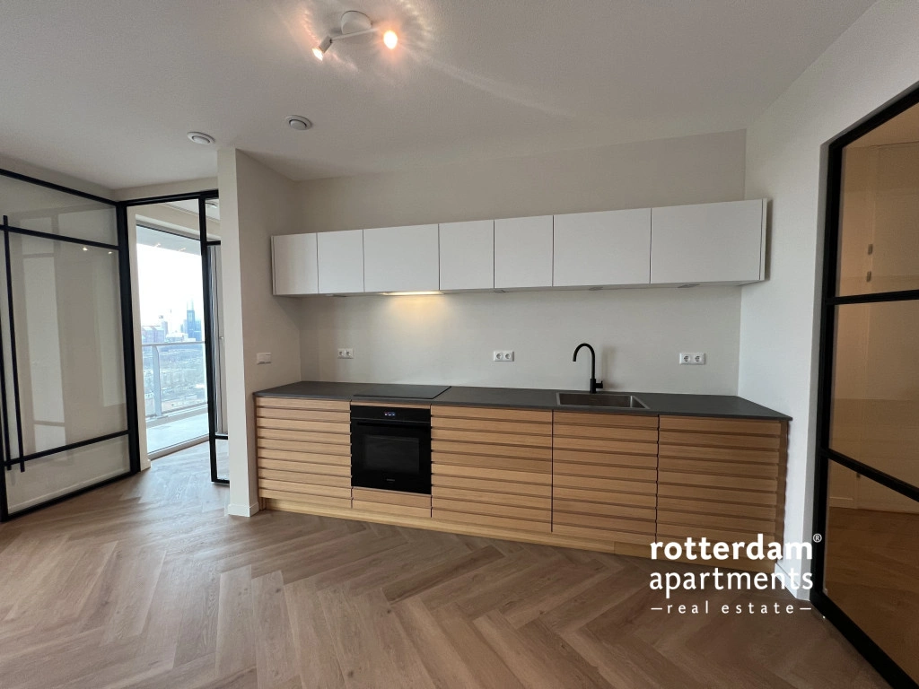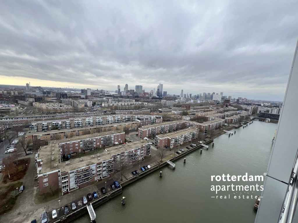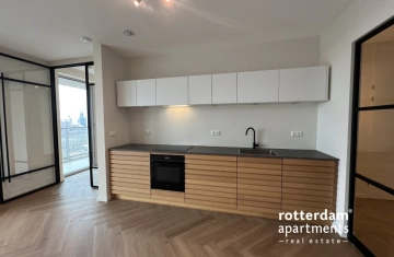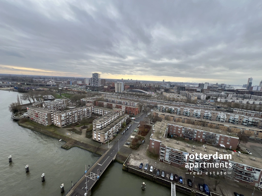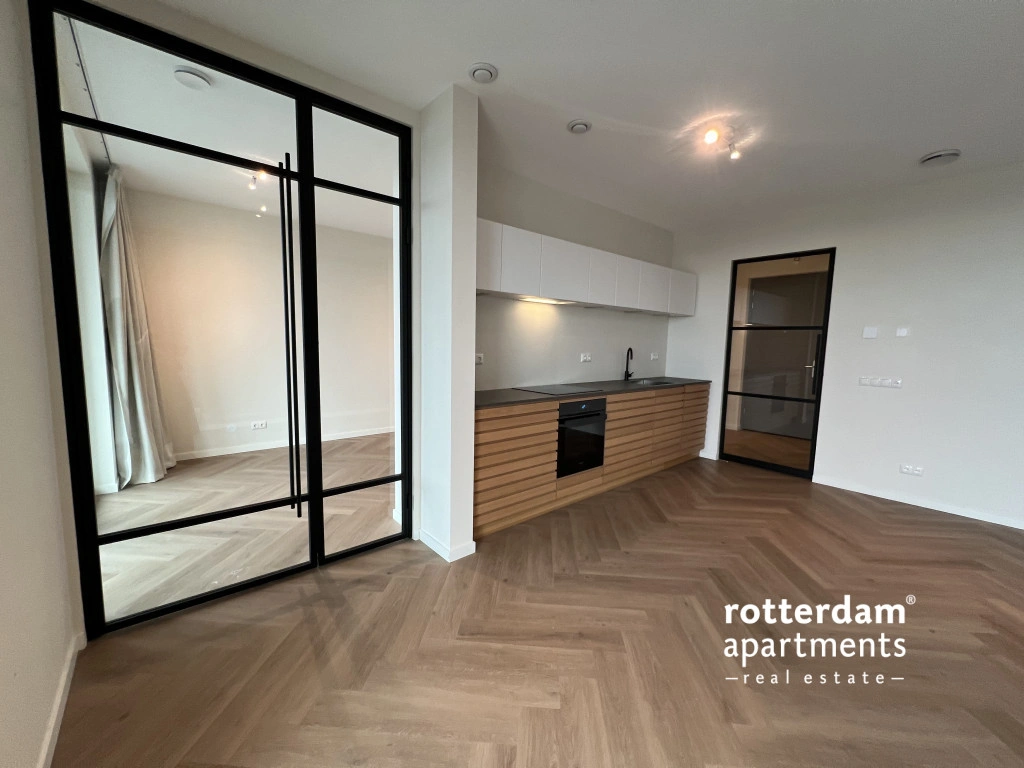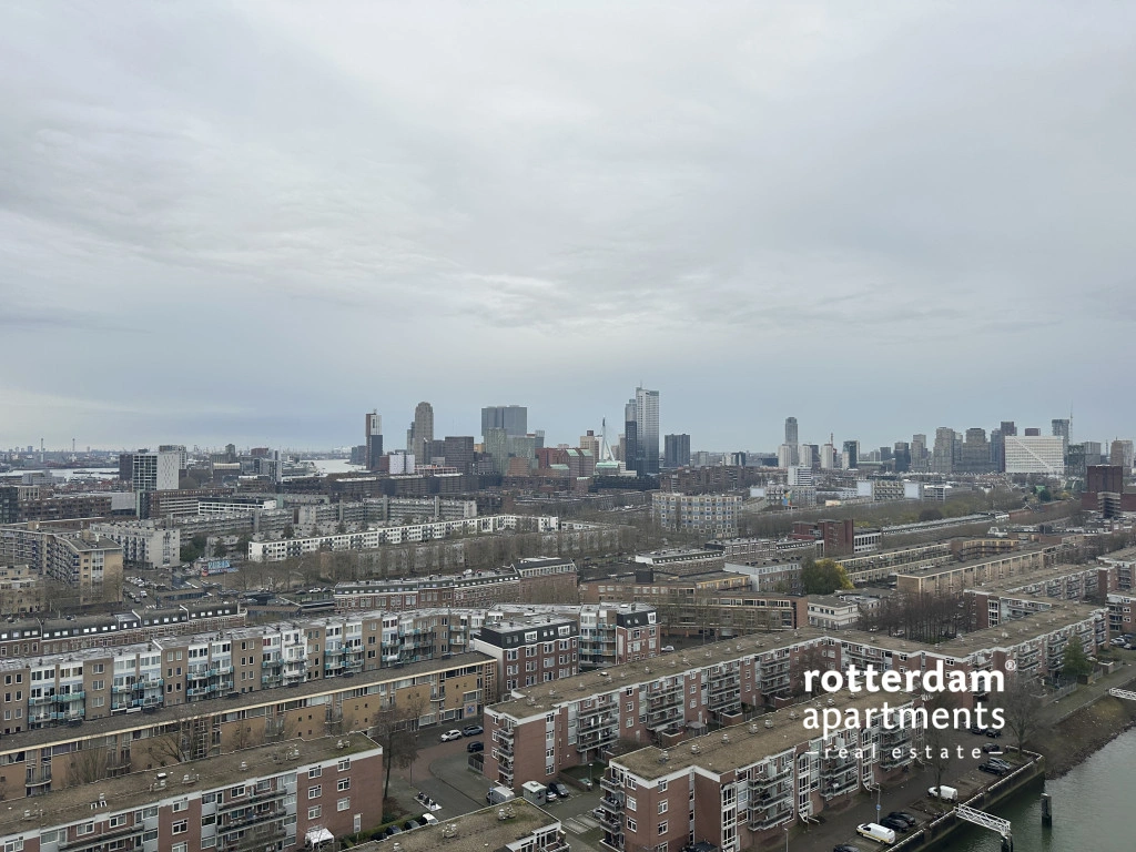 Zowel de woonkamer als de slaapkamer bieden directe toegang tot het brede balkon met uitzicht over de skyline van Rotterdam.