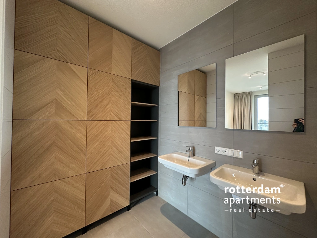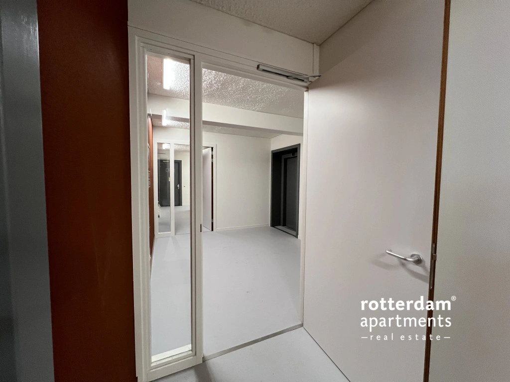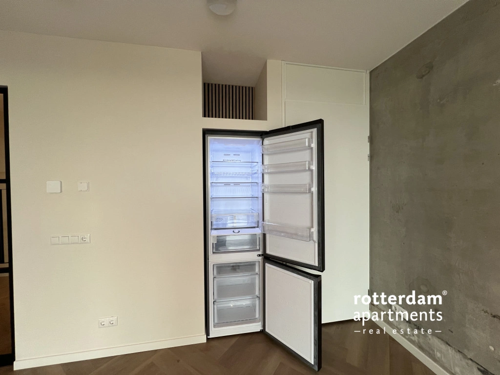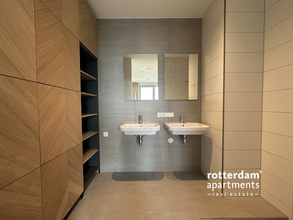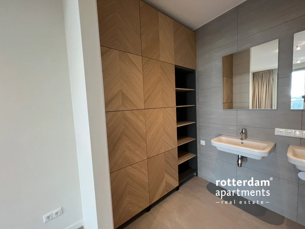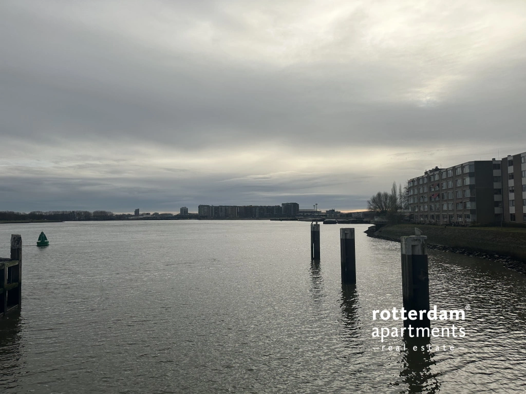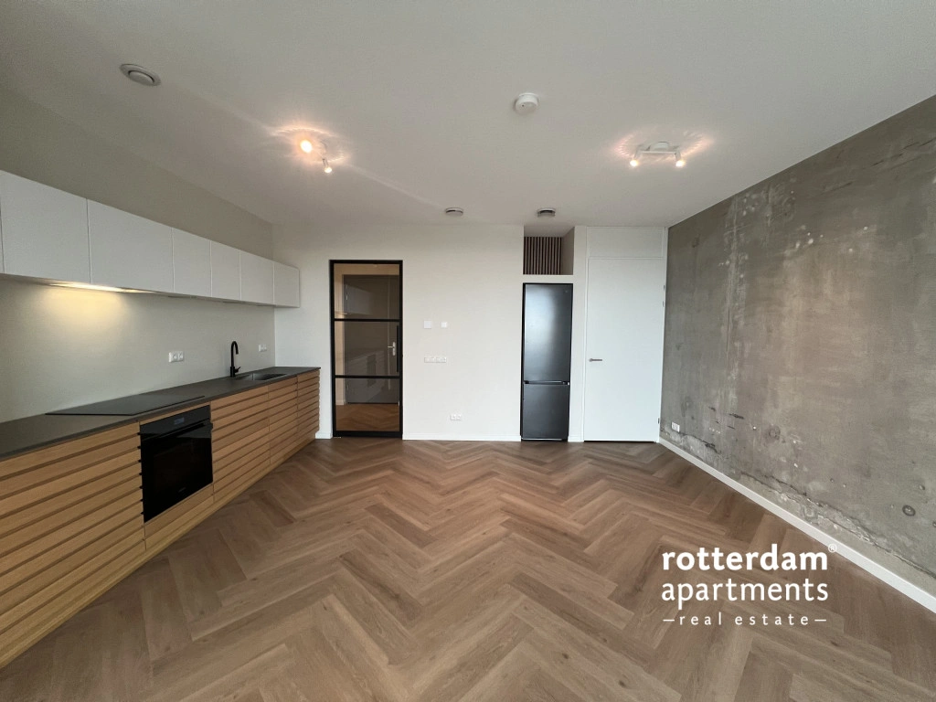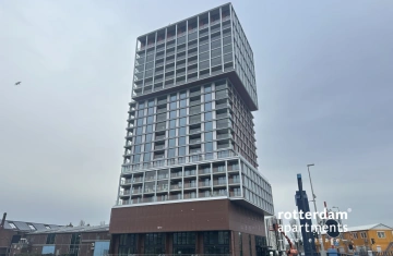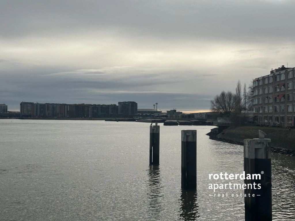 Zowel de woonkamer als de slaapkamer bieden directe toegang tot het brede balkon met uitzicht over de skyline van Rotterdam.