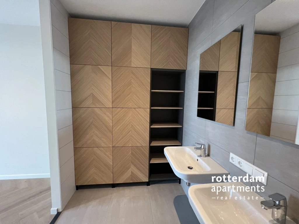 De ruime slaapkamer beschikt over een en-suite badkamer met dubbele wastafel, inloopdouche, twee spiegels en ingebouwde kastruimte. Daarnaast is er een ruim, separaat toilet met fonteintje en een aparte wasruimte voorzien van een wasmachine, droger en extra opbergkasten.