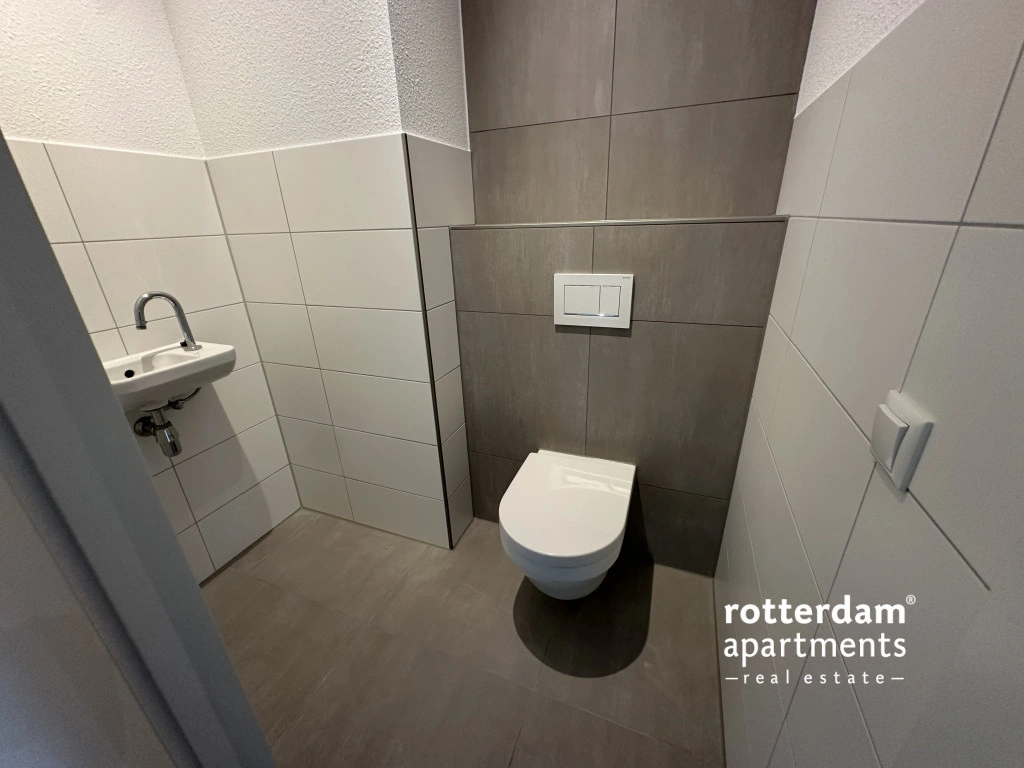 U betreedt het appartement via de hal, die toegang biedt tot de woonkamer, het separate toilet en de wasruimte. Het gehele appartement is strak afgewerkt met witte wanden en een fraaie PVC visgraatvloer.