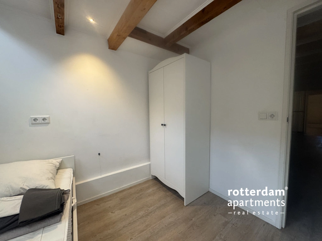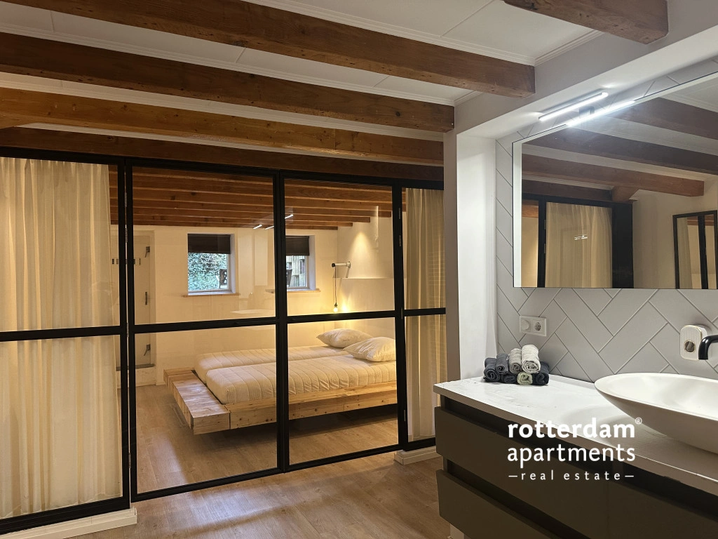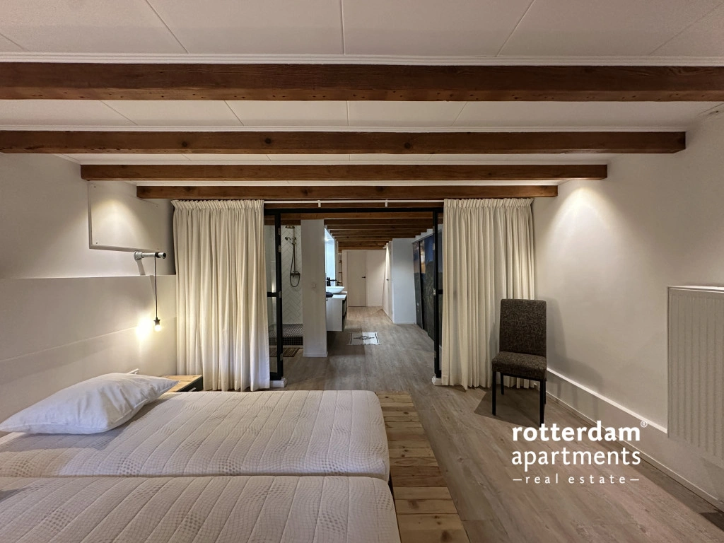 Aan de achterzijde ligt de royale hoofdslaapkamer, afsluitbaar met glazen deuren en voorzien van gordijnen voor privacy. Deze ruime kamer beschikt over een tweepersoonsbed en directe toegang tot de tuin.