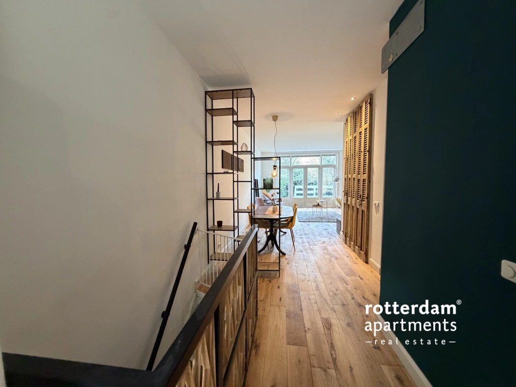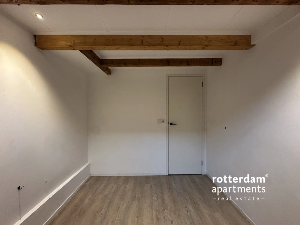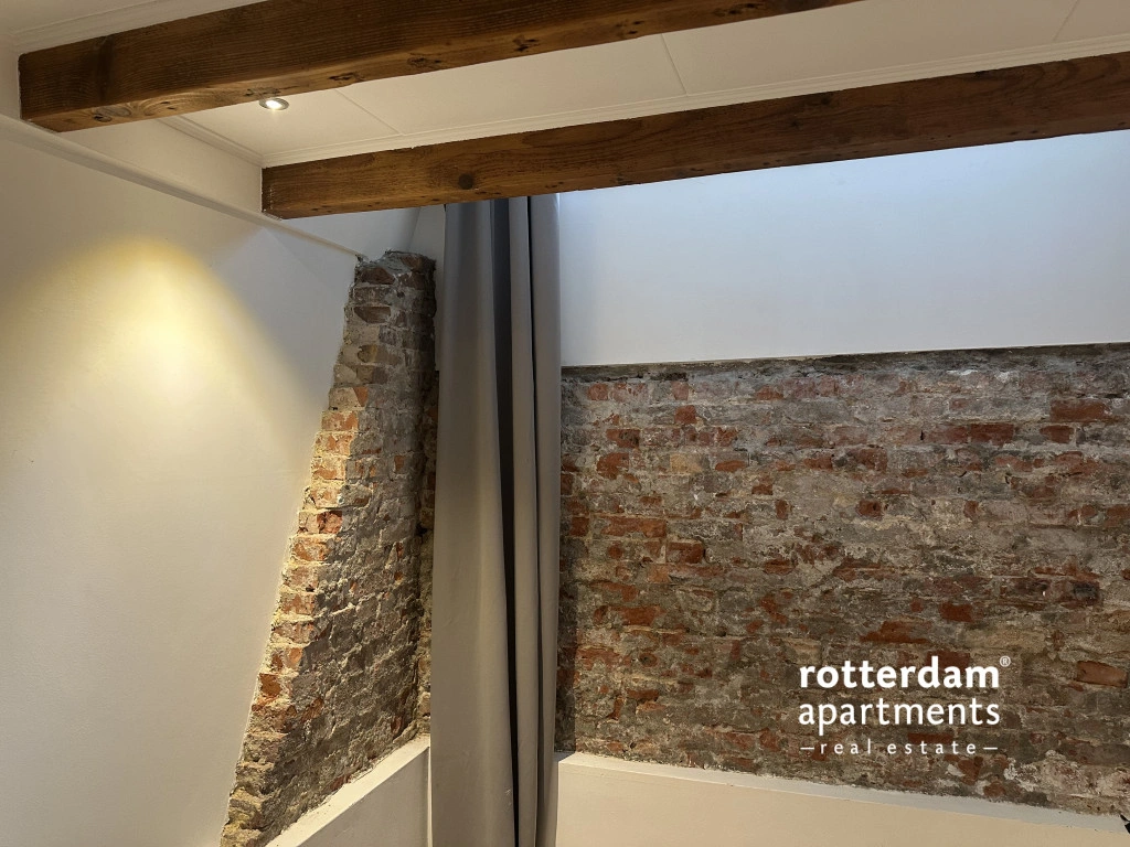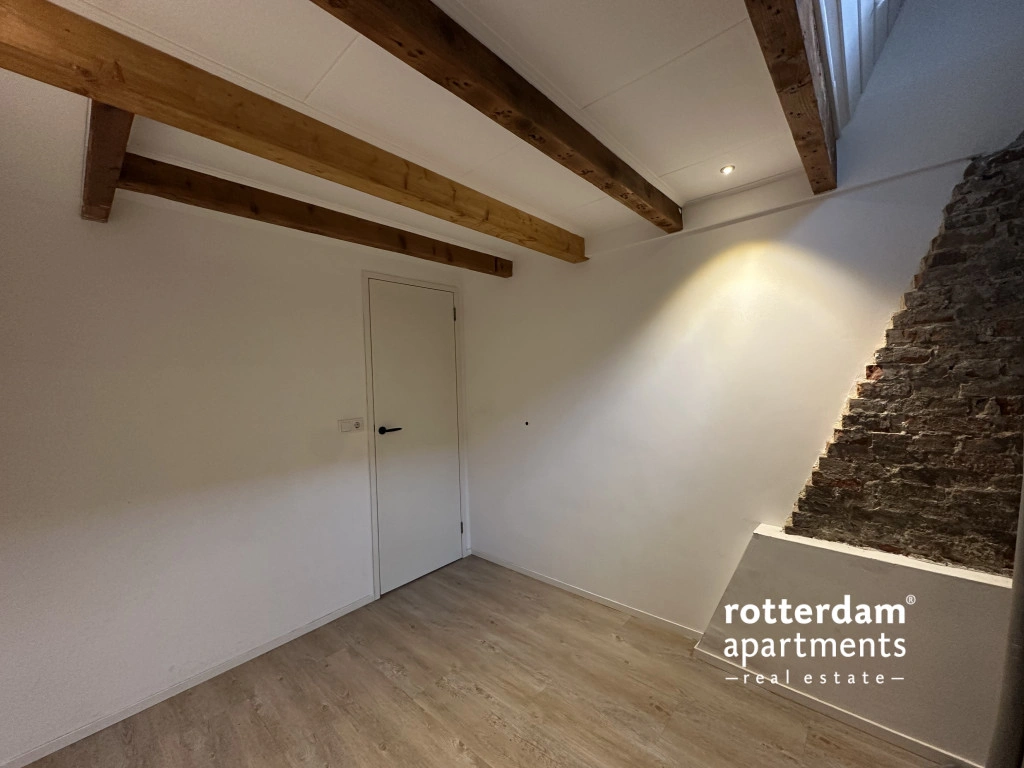 De woning is verdeeld over twee woonlagen en combineert een moderne afwerking met karakteristieke elementen, zoals een warme houten vloer en zichtbare balken in het souterrain.