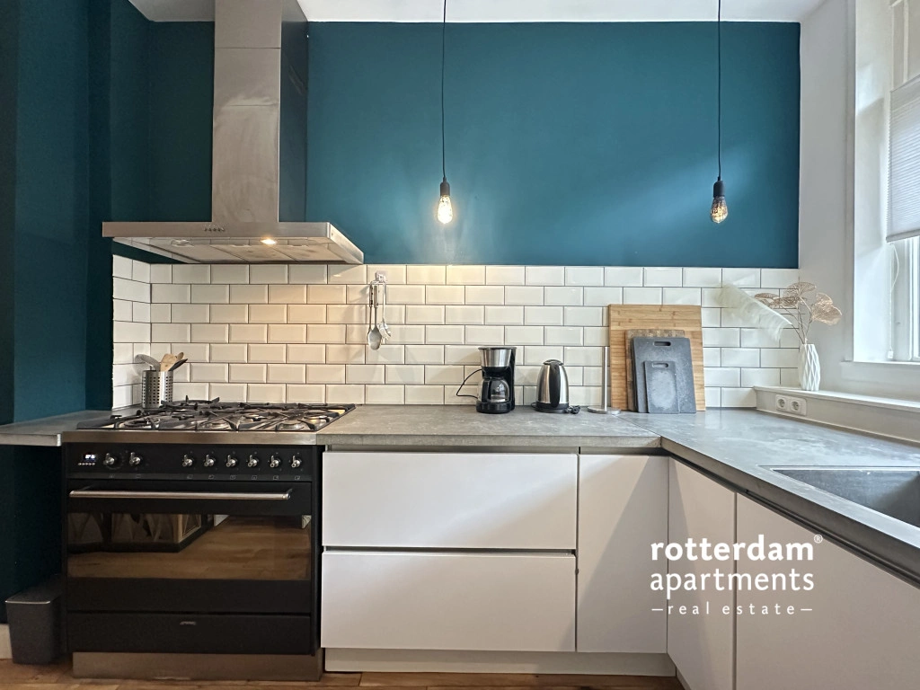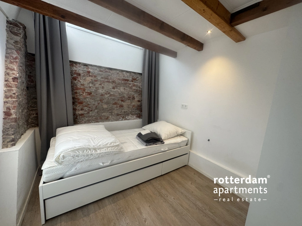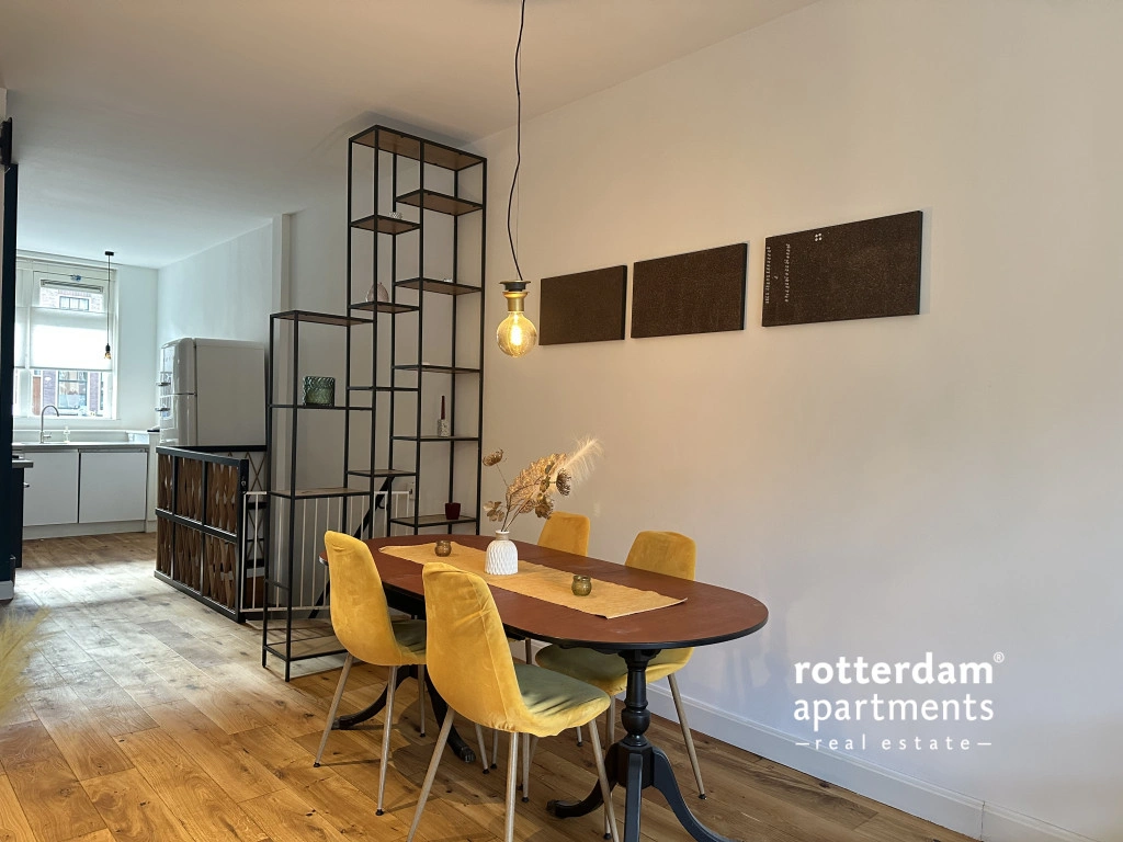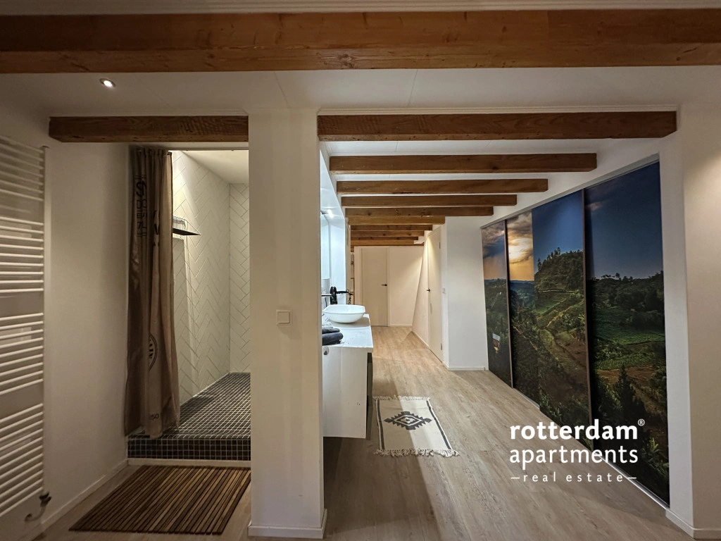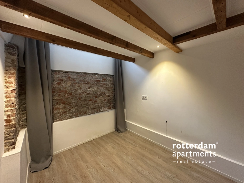 De woning is verdeeld over twee woonlagen en combineert een moderne afwerking met karakteristieke elementen, zoals een warme houten vloer en zichtbare balken in het souterrain.