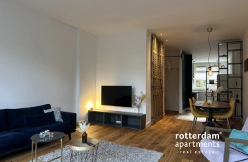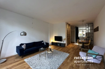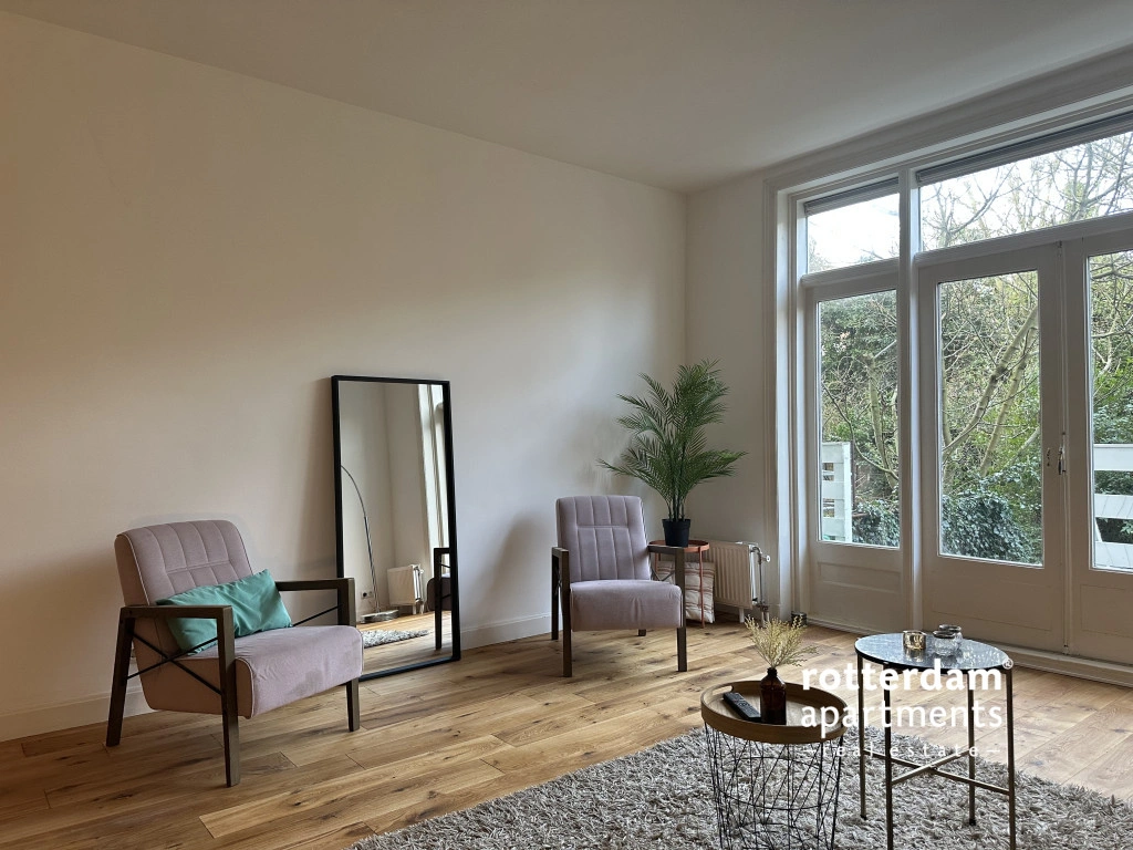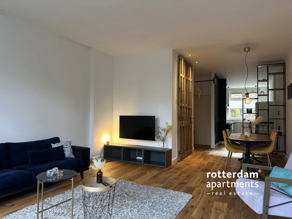 voorzien van een houten vloer en ingericht met onder andere een donkerblauwe zitbank, twee fauteuils, een vloerkleed, salontafel en tv-meubel. Via twee openslaande deuren heeft u toegang tot het balkon en de tuin, waardoor binnen en buiten naadloos in elkaar overlopen.