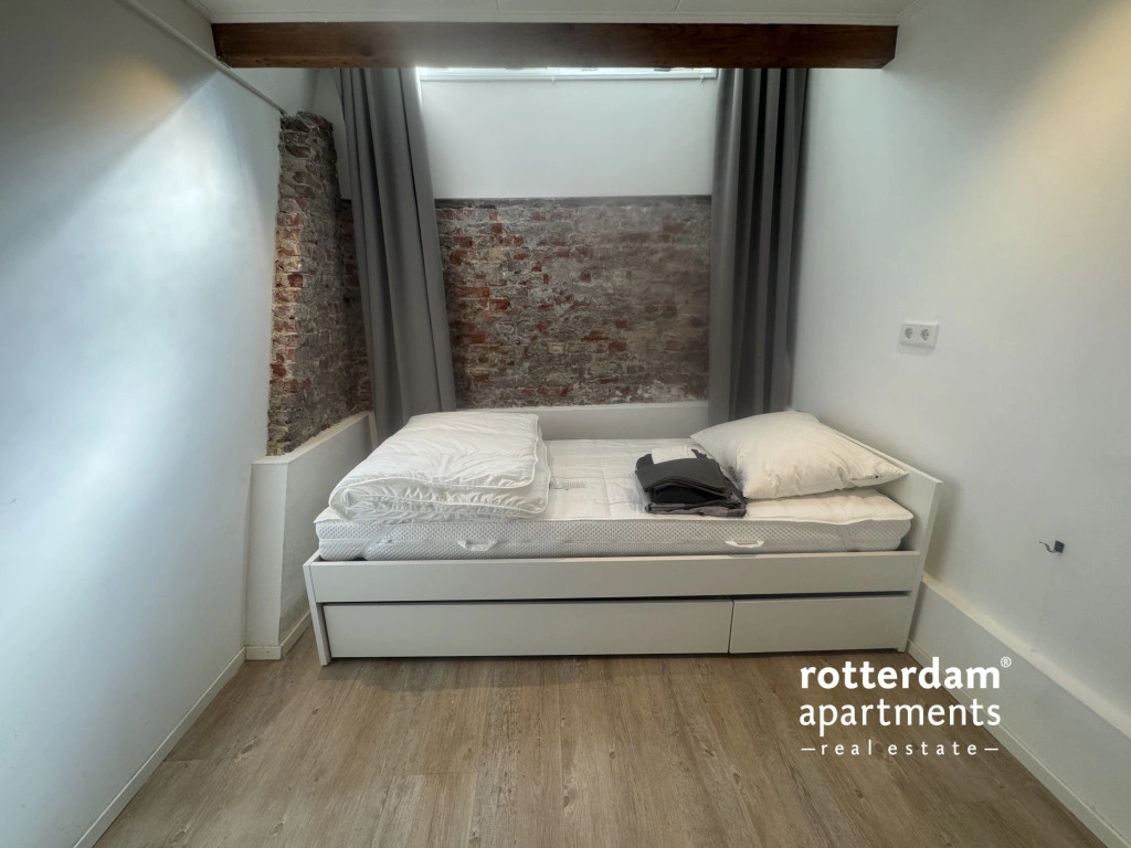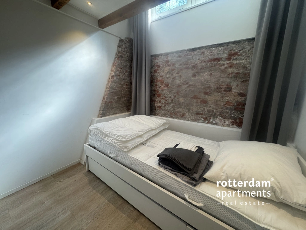 Via een trap naar beneden bereikt u het souterrain, waar zich de slaapvertrekken en de badkamer bevinden. Aan de voorzijde ligt de kleinere slaapkamer, ideaal als kinder- of werkkamer. In het midden bevindt zich de open badkamer met wastafel, meubel en spiegel, evenals een ruime inloopdouche.