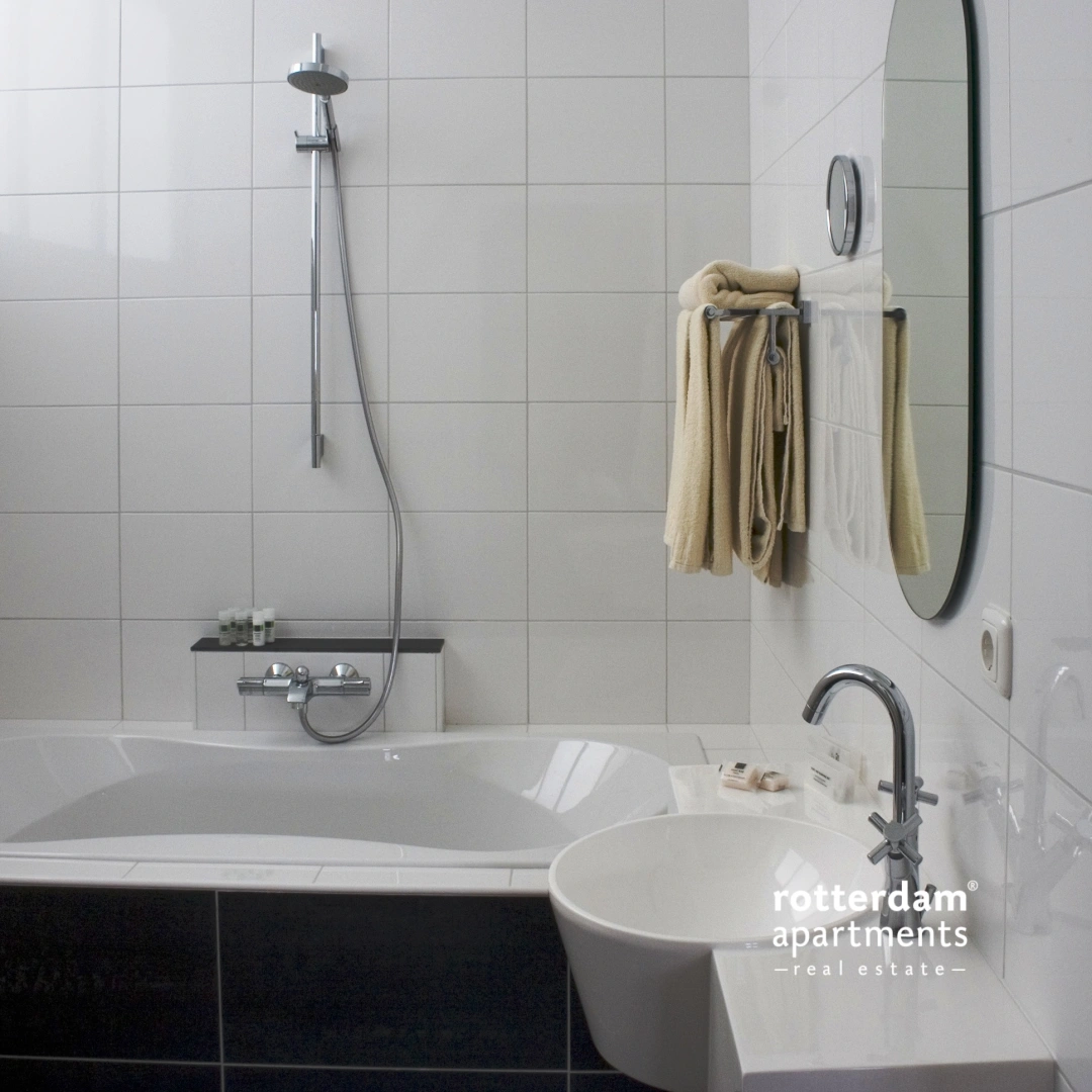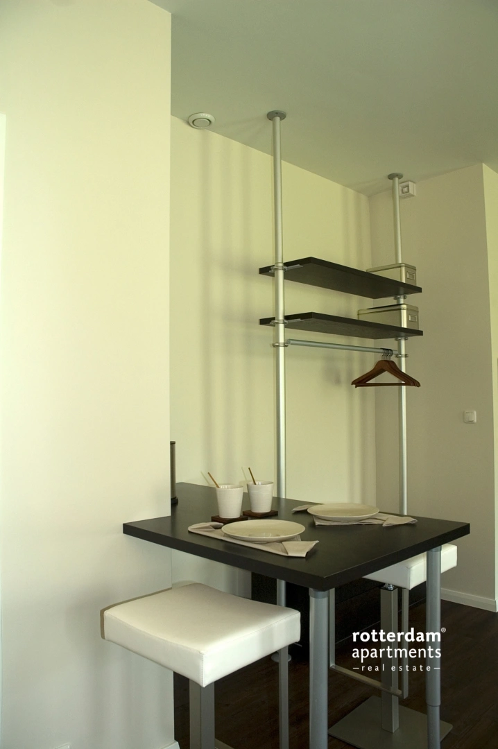 Gezamelijke entree. Entree op de 1e/2e of 3e etage. Entree van studio welke gelegen is aan de voorzijde met fantastisch uitzicht over de Witte de With of aan de achterzijde. De studio's zijn uitgerust met een tweepersoonsbed, tweezitsbank, bijzettafel en TV. De ontbijtbar is voorzien van een koffiezet apparaat, waterkoker en koelkast. De badkamer is voorzien van een ligbad, wastafel met spiegel en toilet.