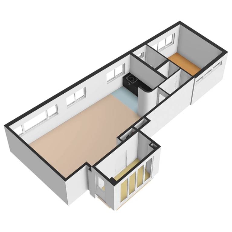 Binnenkomst in de hal die toegang geeft tot de woonkamer met open keuken. De ruime en lichte woonkamer is afgewerkt met een houten vloer, nette witte wanden en grote ramen die zorgen voor veel natuurlijk licht. De moderne zwarte open keuken beschikt over een inbouwspoelbak, diverse kasten en planken met veel bergruimte. Vanuit de woonkamer is er toegang tot de meterkast en een berging.