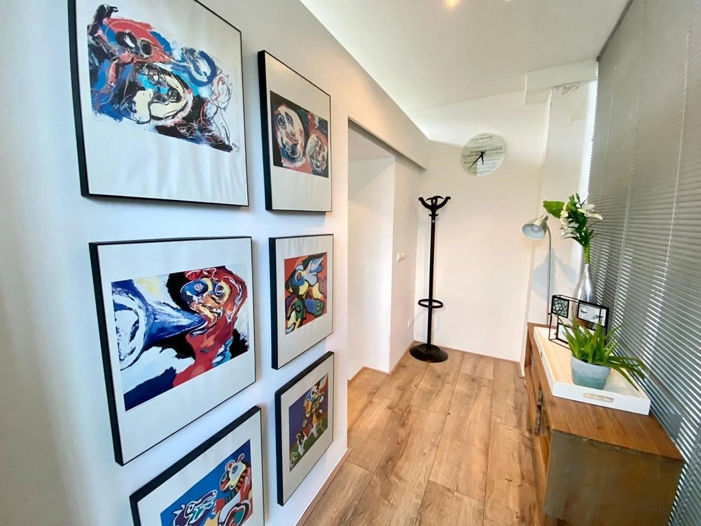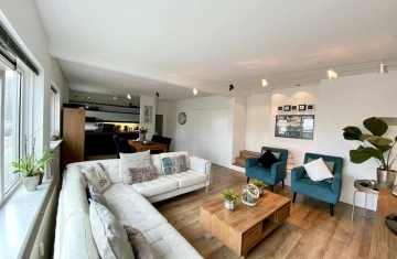 Entrance into the hall that leads to the living room with open kitchen. The spacious and bright living room has wooden flooring, neat white walls and large windows that provide plenty of natural light. The modern black open kitchen has a built-in sink, various cupboards and shelves with plenty of storage space. From the living room, there is access to the meter cupboard and a storage room.