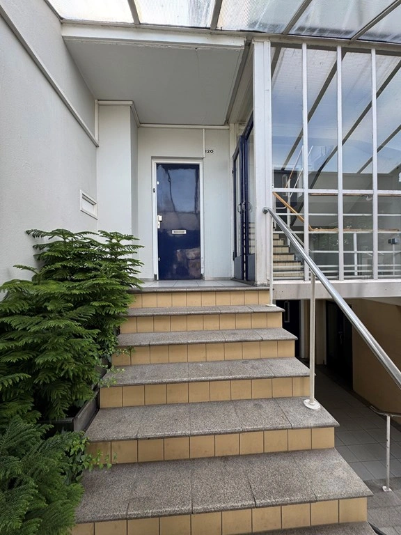 Gezamenlijke entree met brievenbussen, toegang tot de lift, het trappenhuis en de bergingen. Via de eerste trapopgang bereik je direct de entree van het appartement.