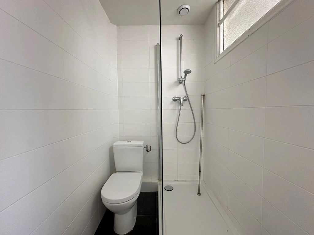 De badkamer is fris afgewerkt met witte wandtegels en een donkere tegelvloer. Je vindt hier een inloopdouche, een wastafelmeubel met spiegel, een tweede toilet en natuurlijk daglicht dankzij een hoog geplaatst raam.